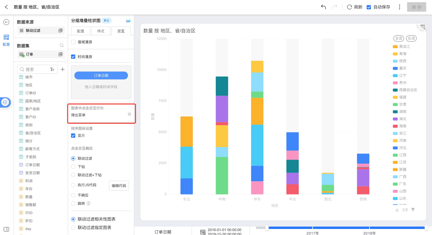 支持下钻、排除的图表类型,详见附录:各种图表汇总。 可以设置单击维度分组的三种显示方式: