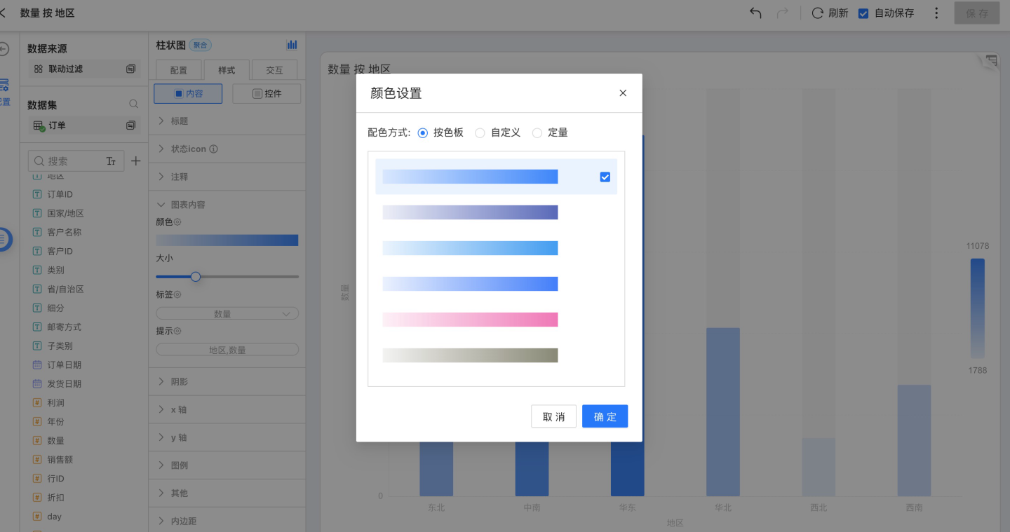 图内度量排序: 可以选择同一图表中的度量字段,按照度量字段的聚合结果对维度进行排序。