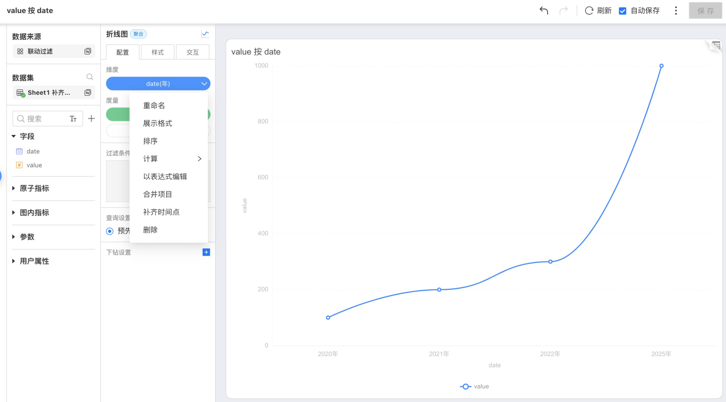 | 折线图 | 1 | 1~N | 数据源/字母/字段/手动排序 | 允许 | 各个度量 | 单选多选 | 度量值 | 维度分组 | 固定值/计算值 | 允许 | 维度分组 |