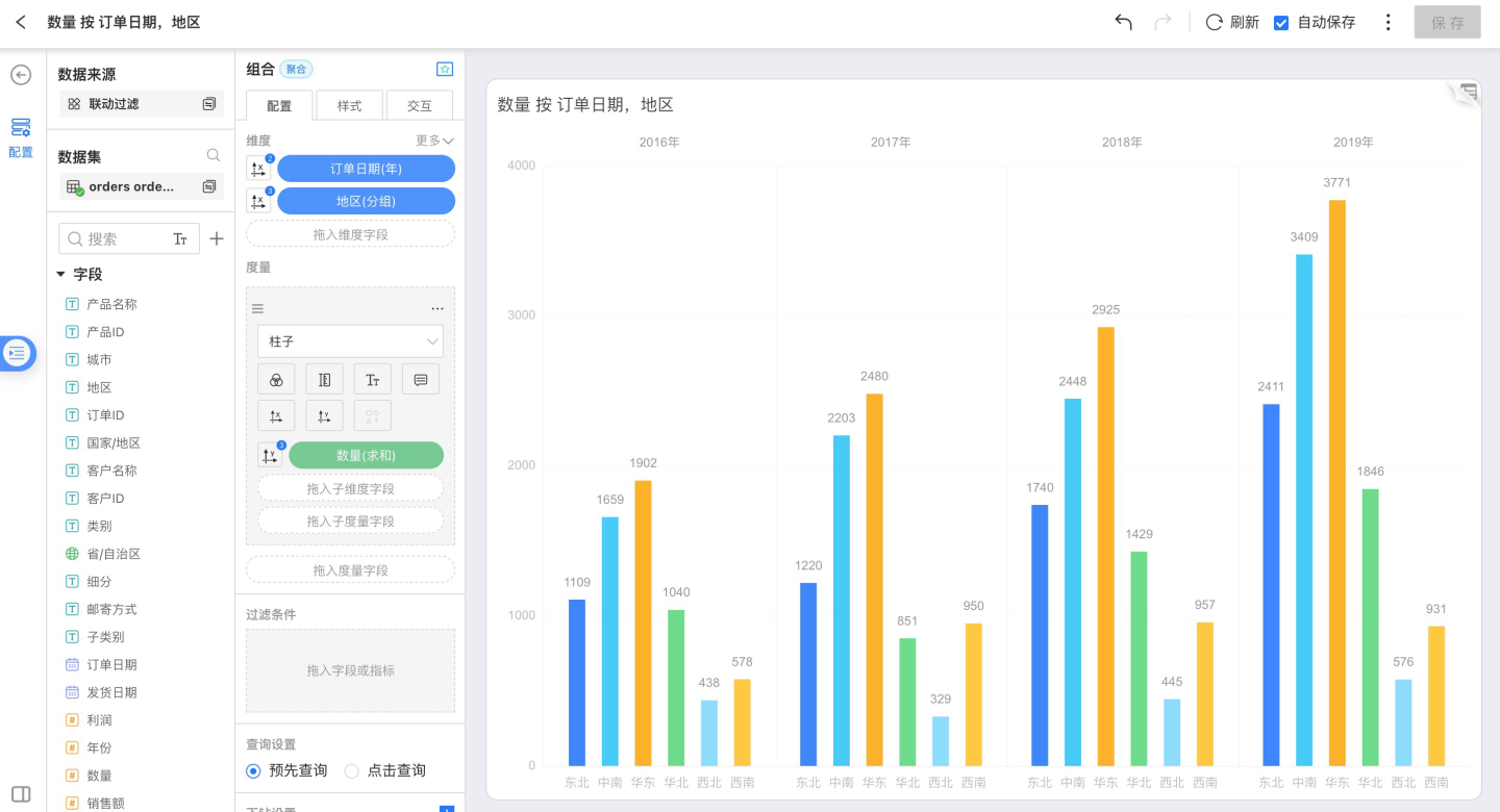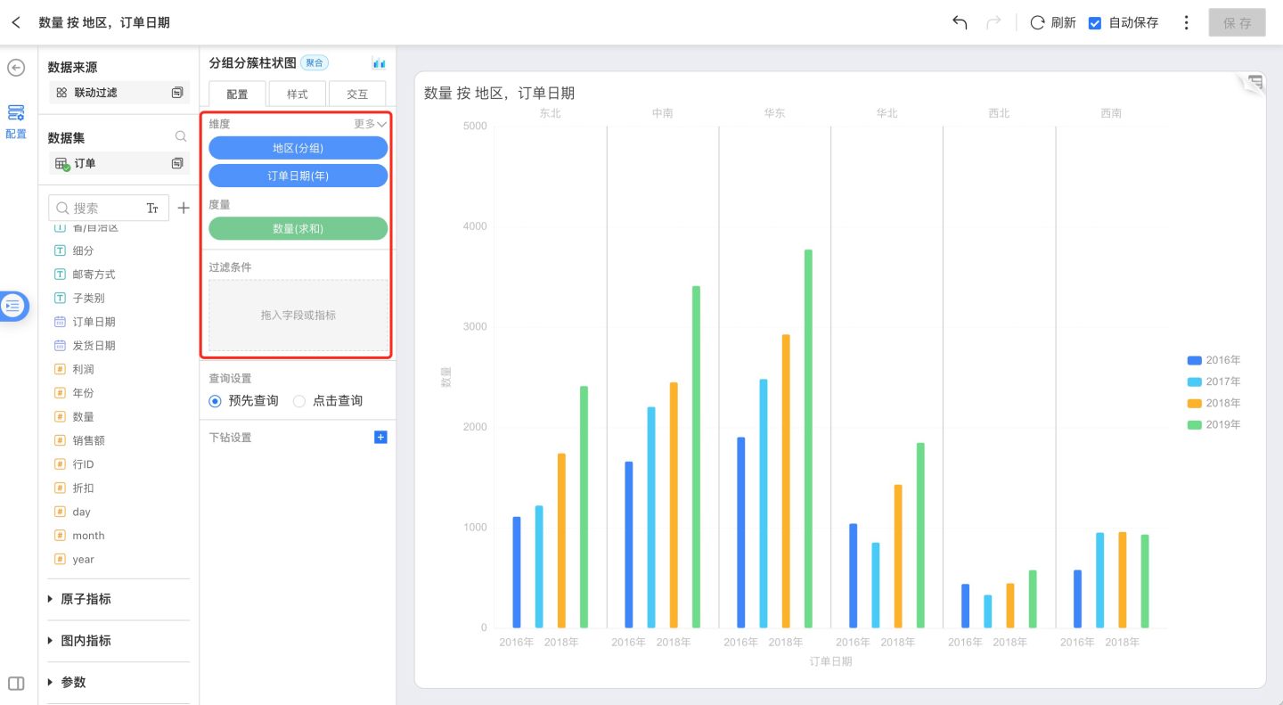 | 分簇柱状图 | 1 | 1~N | 数据源/字母/字段/手动排序 | 允许 | 各个度量 | 单选多选 | 度量值 | 维度分组 | 固定值/计算值 | 允许 | 维度分组 |