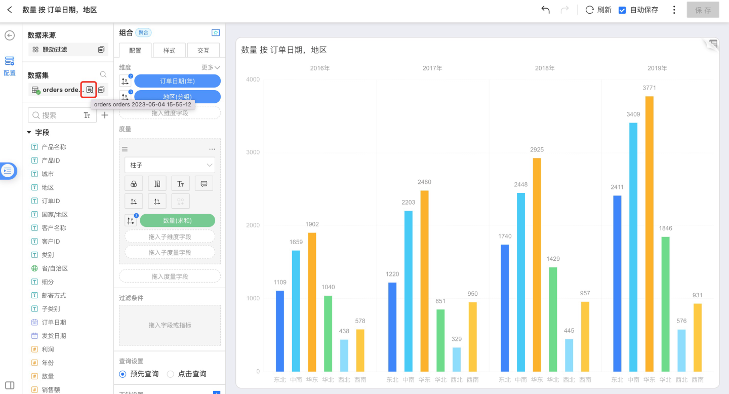 字段: 当前数据集所有原始字段和新增字段。字段若有分组信息,也同时将分组信息以树形结构展示在字段列表中,方便字段的快速定位。
