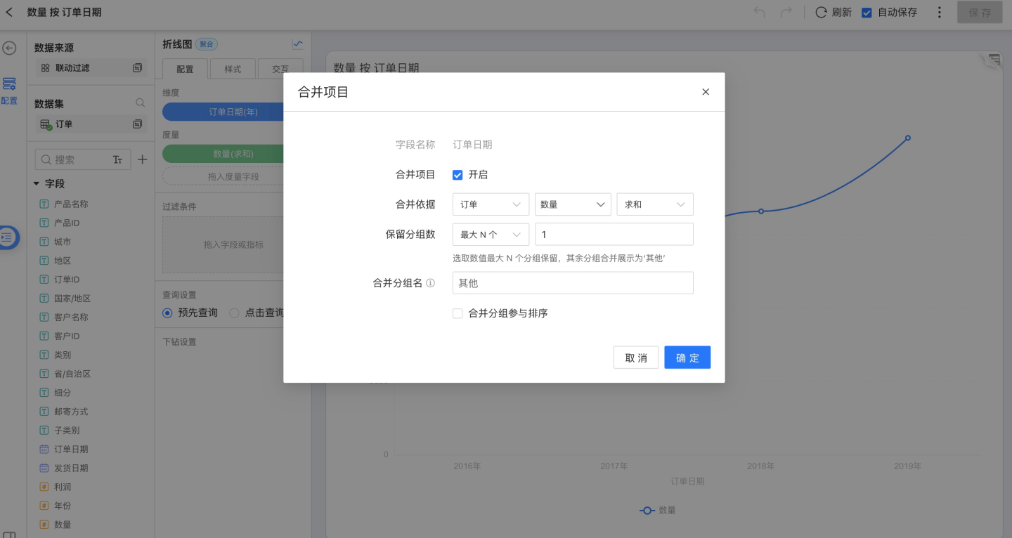 有维度的图表(地图除外)均支持合并项目为其它。当分组的数据在展示过程中仅关注占比较高的项目时,可以将占比较小的项目合并为其它,合并后展示的图表更简洁明了。