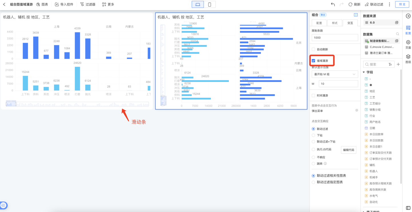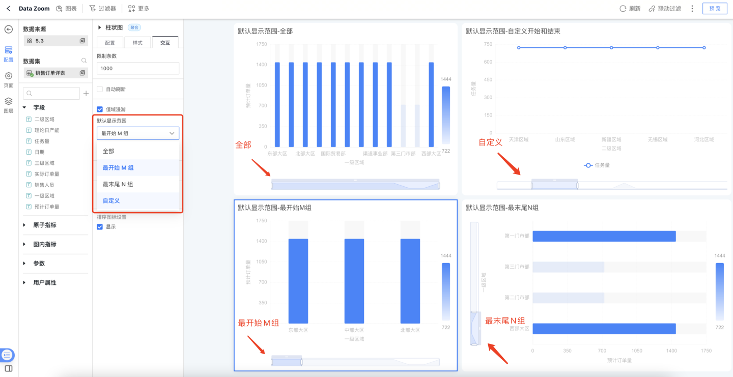 当某些图表数据分组较多(如柱状图),但又不期望打开默认展示全量分组时,则可以配置值域漫游(Data Zoom)默认显示范围,分别可配 “全部、最开始 M 组、最末尾 N 组、自定义 ”4个选项,满足多种配置场景。