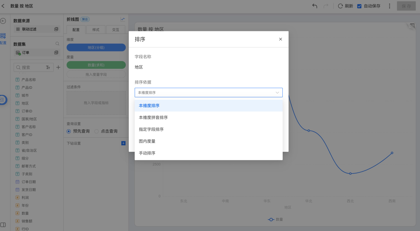 维度排序依据包括:数据源排序、字母、字段以及手动排序。