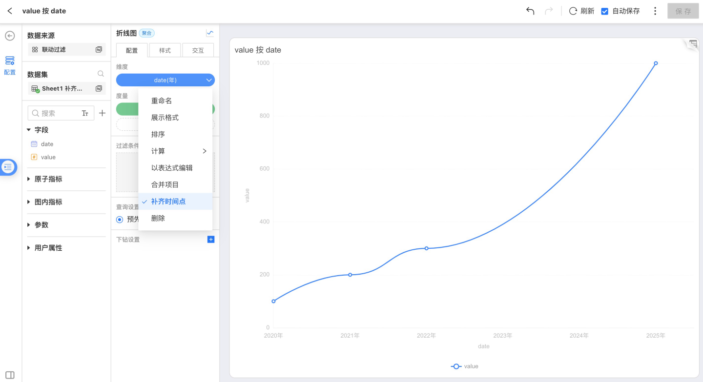- 补齐时间点: 选择时间维度时,会出现补齐时间点选项。
