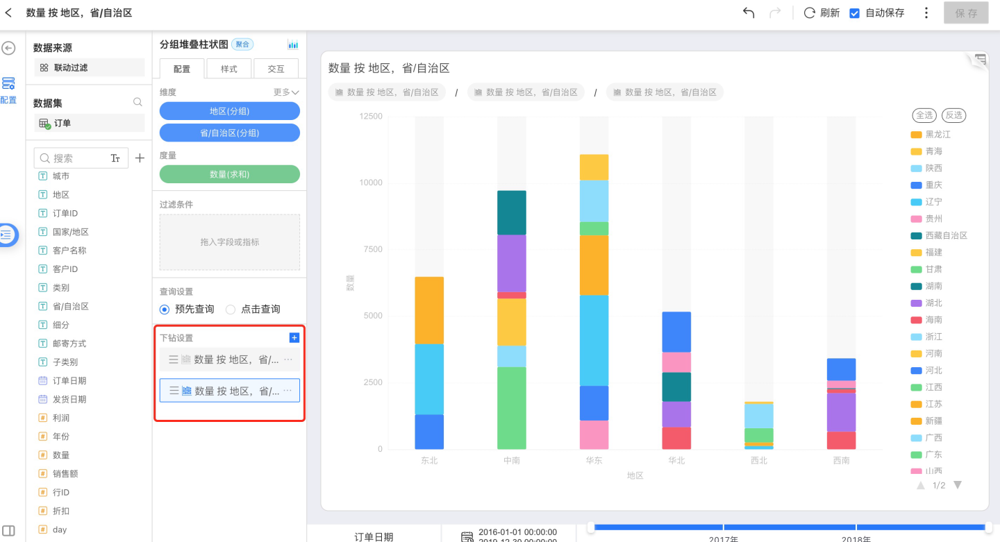 在支持下钻的图表中选择一个字段拖入交互->下钻设置中,点击图表某个维度,在弹出的 Tooltip 菜单中点击下钻。图表将以所选维度为过滤条件,以新选择的字段为维度重新出图。可以连续下钻。