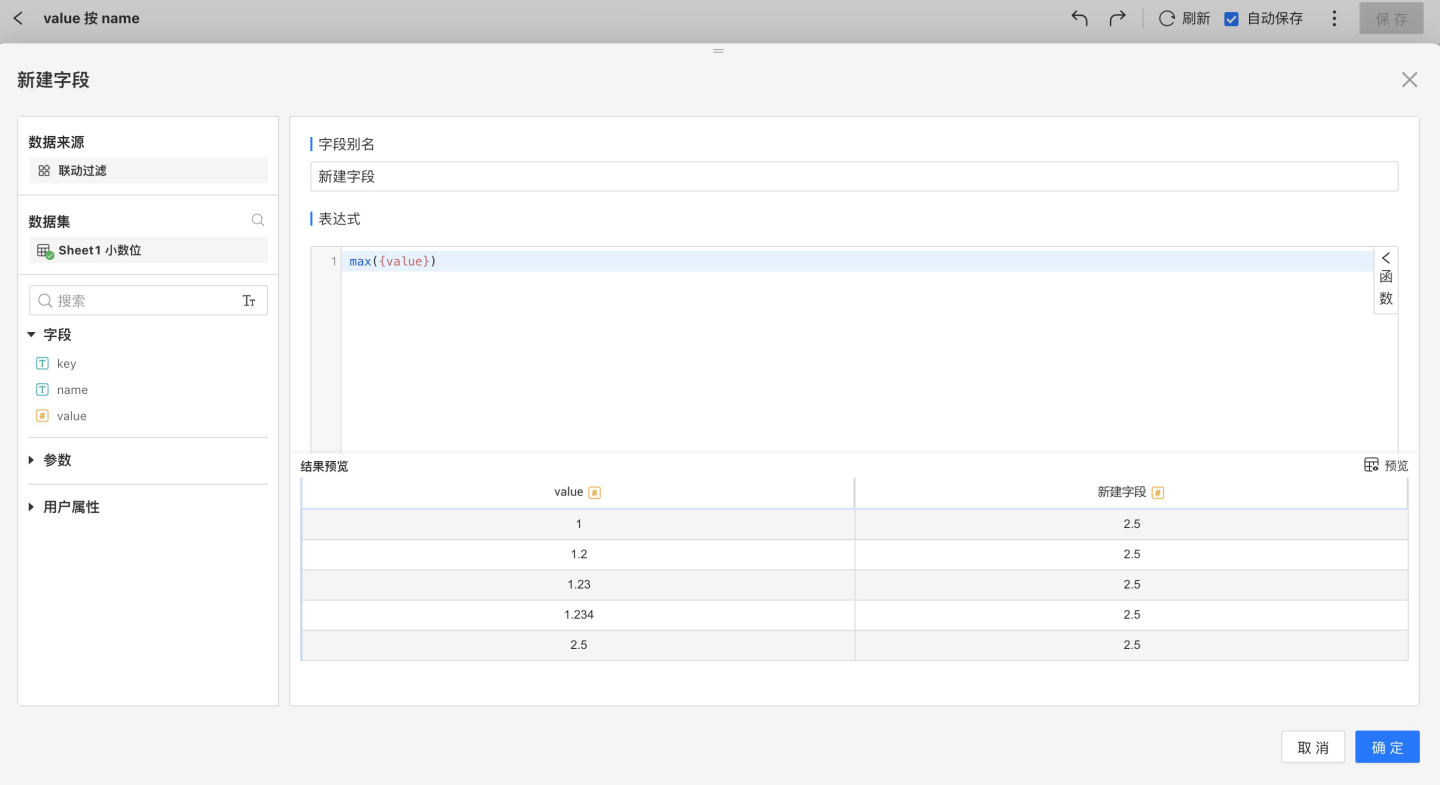 - 小数位数: 默认显示为2位小数,可自定义设置小数位数。
