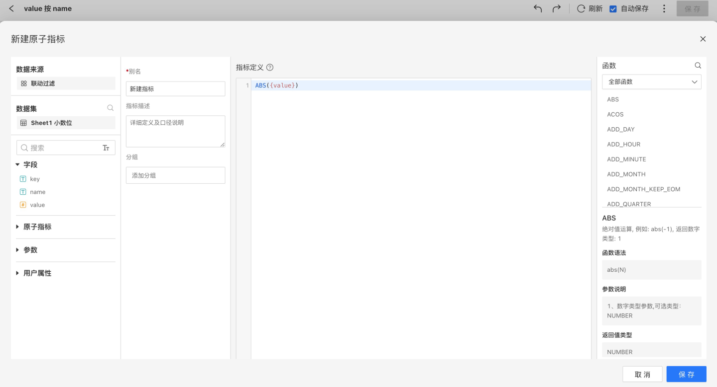 计算指标: 依赖该数据集新增的全部指标。指标的分组信息也同样会展示在指标列表中。