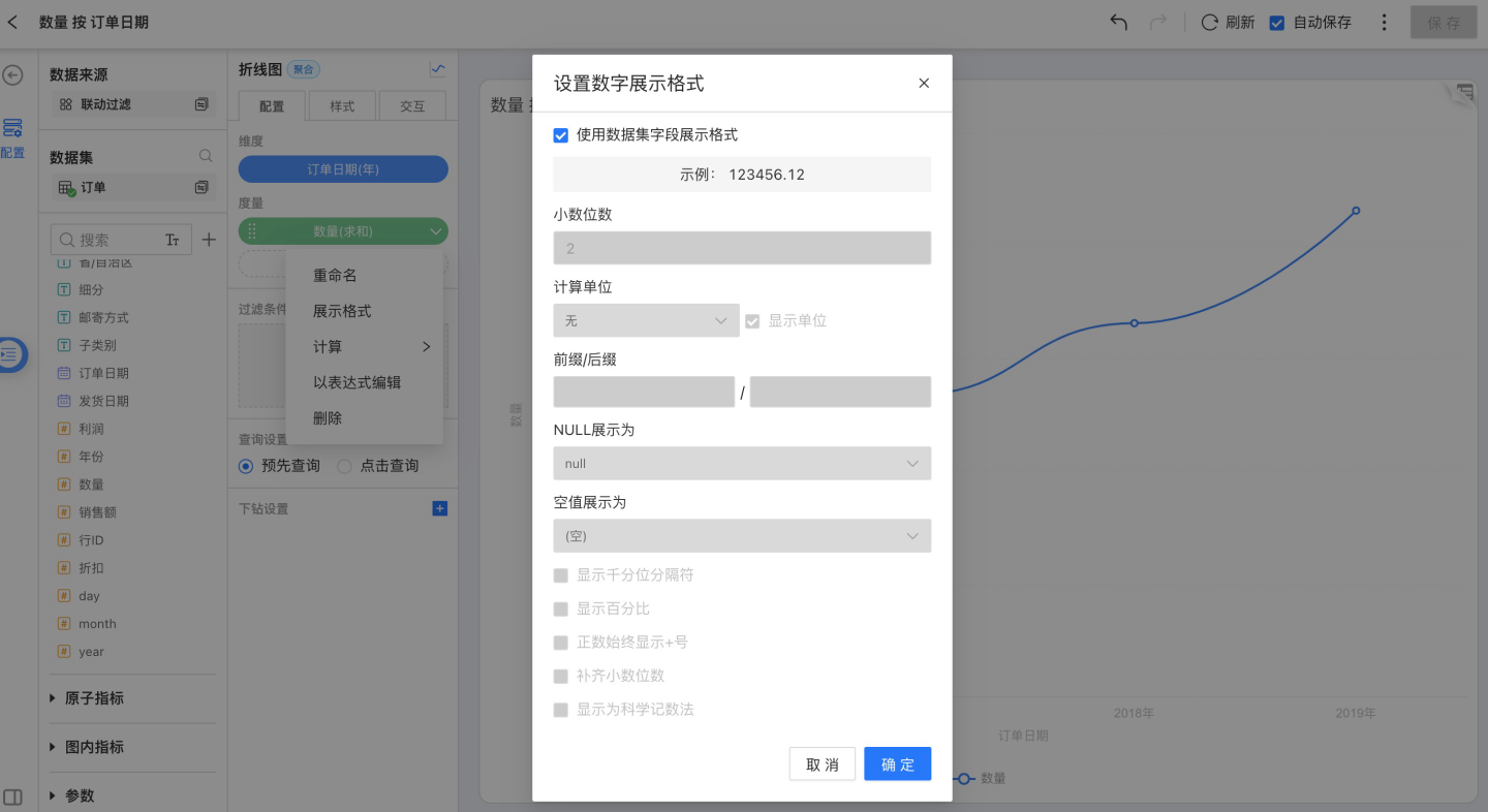 数字类型的展示格式如下,可自定义设置数字展示格式: