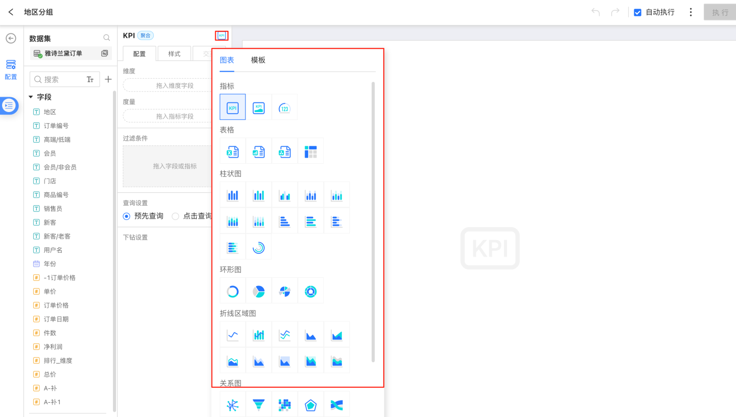 点击确定后,进入图表编辑界面,选择图表类型,根据业务场景创建图表。