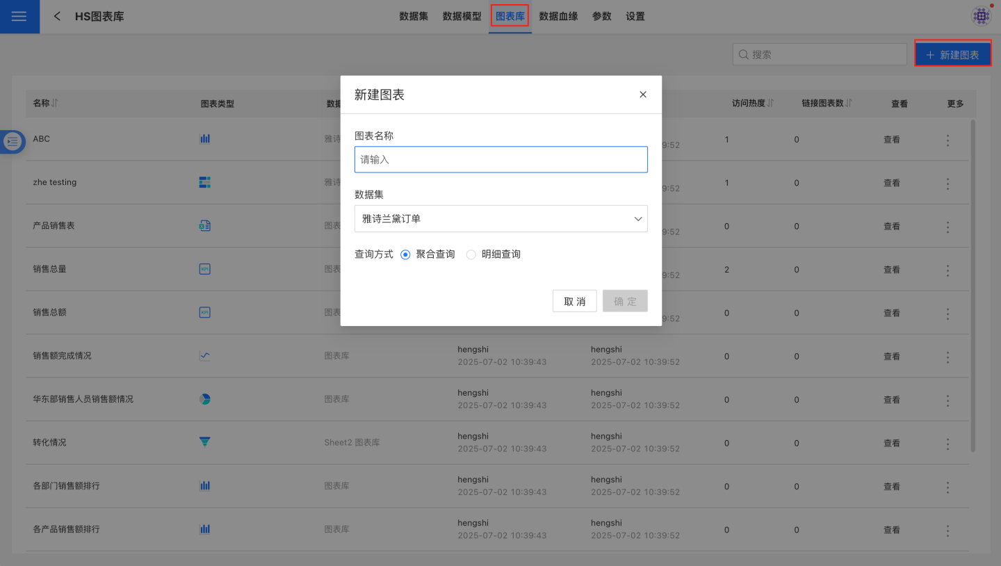 点击右上角的新建图表,弹出新建图表的窗口,选择数据来源、数据集,查询方式。