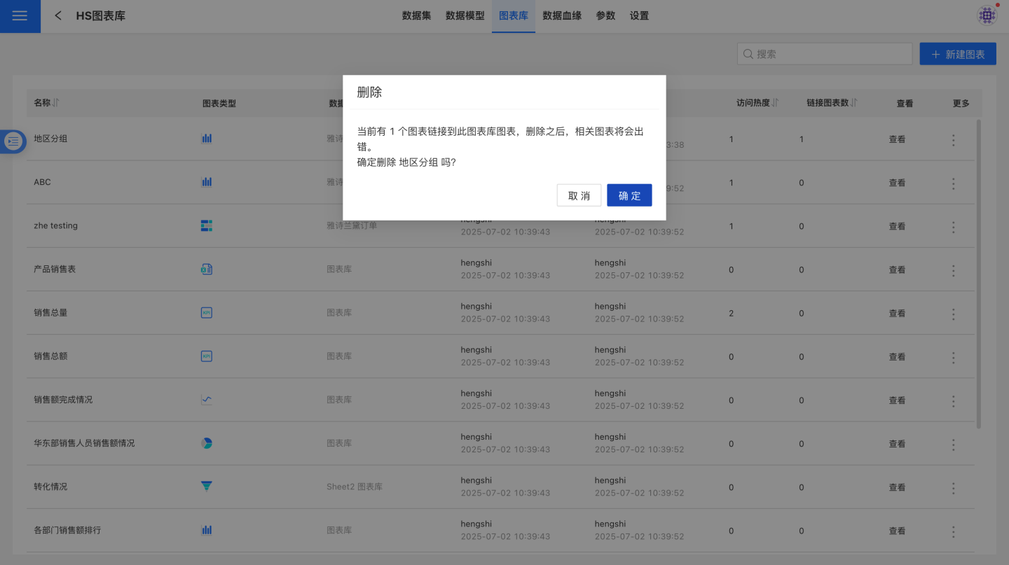 点击图表库三点菜单中的删除按钮,弹出确认窗口,点击确认后删除图表。