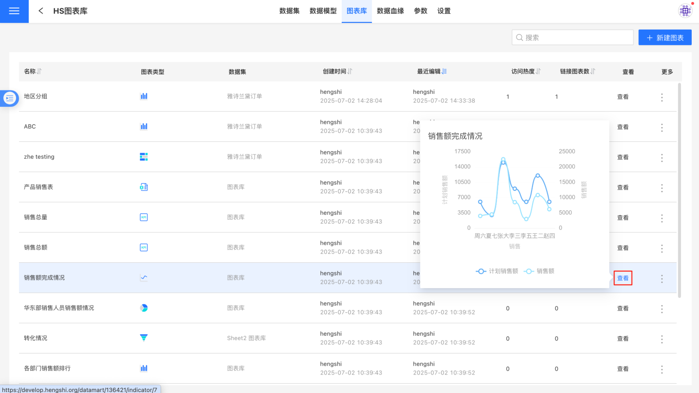 图表库以列表方式呈现图表的详细信息,用户可以按照名称、创建时间、最近编辑、访问热度、链接图表数进行排序。当鼠标悬停在查看上时会展现图表库图表内容。