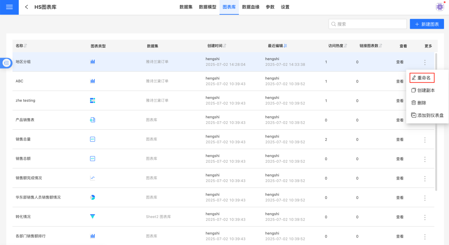 点击图表库图表右侧的三点菜单重命名。