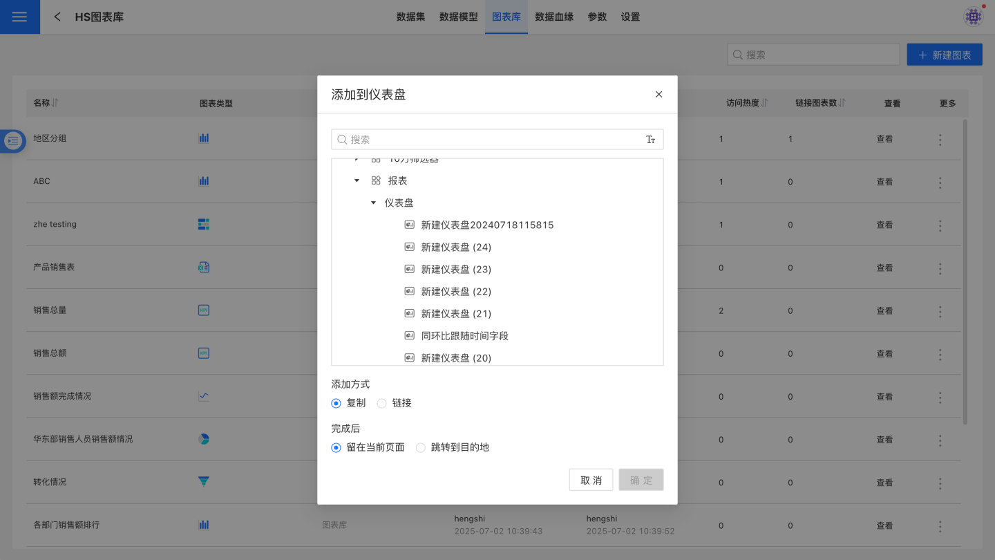 - 复制:将图表库图表复制到仪表盘中,仪表盘中的图表是一个独立的全新的图表,可以随意编辑。