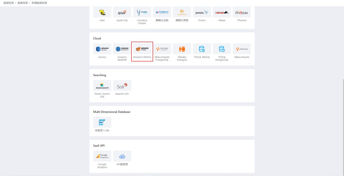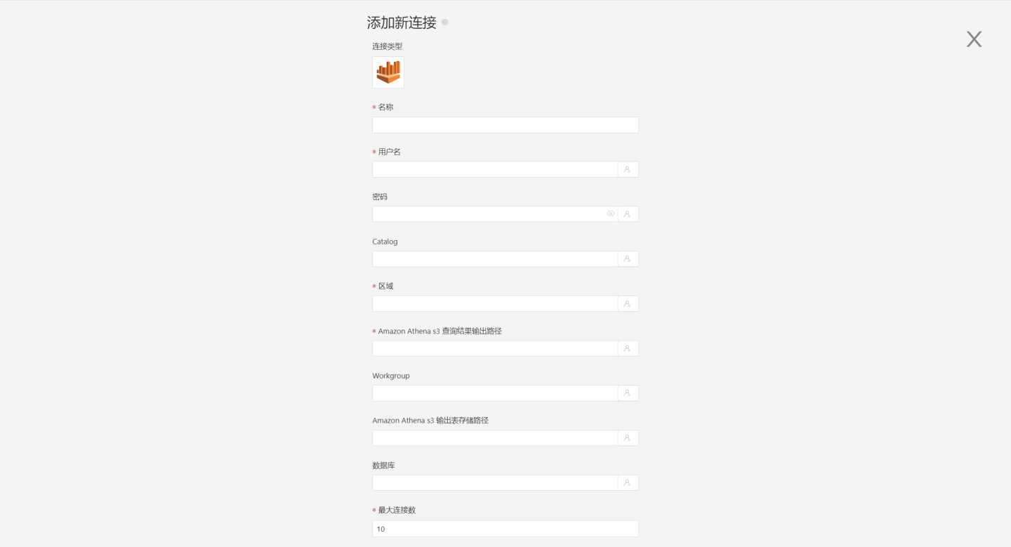 字段 说明 名称 连接的名称。必填,且用户内唯一 机器地址 数据库的地址。如果填了 url 字段,优先使用 url 里面的 端口 数据库的端口。如果填了 url 字段,优先使用 url 里面的 用户名 IAM key 密码 IAM 密码 数据库 数据库名称 Catalog AWS 元数据的 catalog,默认为 AwsDataCatalog 区域 区域名字,比如 cn-north-1 Amazon Athena s3查询结果输出路径 Amazon Athena s3 查询结果输出路径,比如 s3://athena-result/result/Workgroup work group Amazon Athena s3输出表存储路径 Amazon Athena s3 输出表存储路径,仅用于输出的场景,比如 s3://athena/0-storage/最大连接数 连接池最大连接数 优先使用数据库 comment 做数据集的标题 优先显示表的名字还是表的注释。开启时显示标题,关闭时显示表注释 URL 数据库的 jdbc url 查询超时时间(秒) 默认为 600. 当数据量较大时,可以适当增加超时时间 允许写入操作 表示该连接可以在数据集成,批量同步中选择为输出连接。需要有对数据库有写权限且验证通过后,才能配置该参数。 支持上传文件到指定路径 表示新建本地文件数据集时, 生成的表存放的数据库名称。需要有对数据库有写权限验且证通过后,才能配置该参数。 只显示指定数据库/模式下的表 该项选中时并且 database 字段不为空,则只显示该 db 下面的表 填好参数后,点击