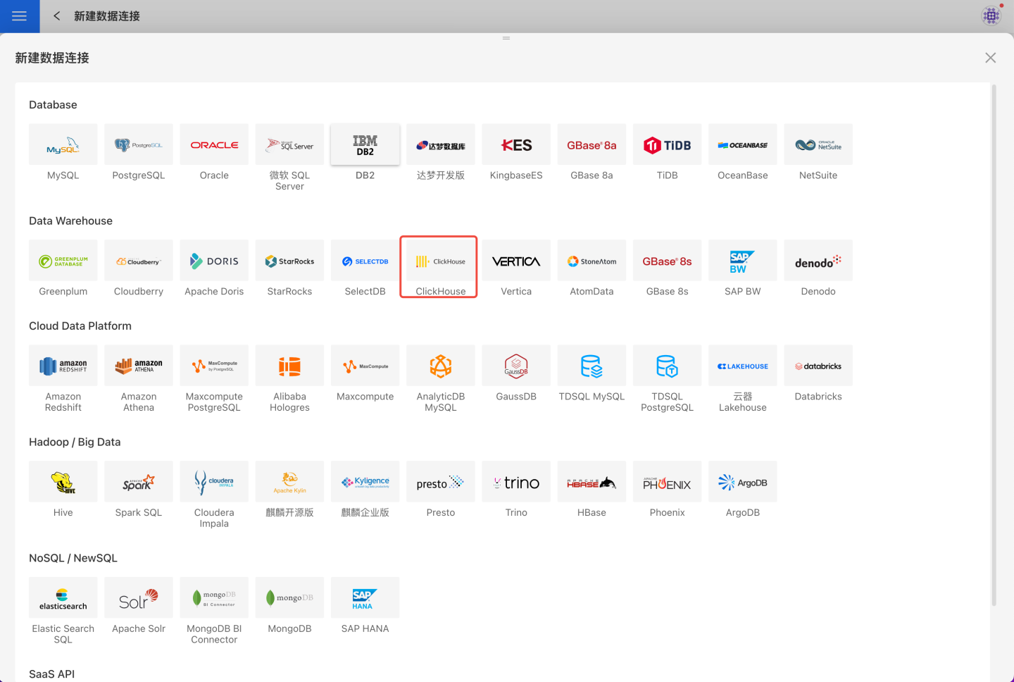 字段 说明 名称 连接的名称。必填,且用户内唯一 机器地址 数据库的地址。如果填了 url 字段,优先使用 url 里面的 端口 数据库的端口。如果填了 url 字段,优先使用 url 里面的 用户名 数据库的用户名 密码 数据库的密码 数据库 数据库名称 最大连接数 连接池最大连接数 编码 数据库连接的编码设置 优先使用数据库 comment 做数据集的标题 优先显示表的名字还是表的注释 URL 数据库的 jdbc url Cluster 仅输出使用,输出到指定的 cluster 中。该参数为空时只写本地表 MergeTree 引擎,该参数填写后会根据 cluster 基于本地 MergeTree 表生成分布式表 ClickHouse 输出是否使用表副本 仅输出使用,是否使用表副本。不使用副本则表引擎是 MergeTree,使用副本表引擎为 ENGINE = ReplicatedMergeTree('/clickhouse/tables/{database}/{table}/{shard}', '{replica}') order by %s settings allow_nullable_key=1 ClickHouse 输出表引擎模板 默认为 ENGINE = ReplicatedMergeTree('/clickhouse/tables/{database}/{table}/{shard}', '{replica}') order by %s settings allow_nullable_key=1,用户也可以参照格式改写 join_use_nulls 可以填0或者1,影响 join 的行为 分层加载 schema 和表 默认为 关闭。开启时分层加载 schema 和表,连接过程只加载 schema,需要点击schema才会加载schame下的table 查询超时时间(秒) 默认为 600. 当数据量较大时,可以适当增加超时时间 允许写入操作 表示该连接可以在数据集成,批量同步中选择为输出连接。需要有对数据库有写权限且验证通过后,才能配置该参数。 支持上传文件到指定路径 表示新建本地文件数据集时, 生成的表存放的数据库名称。需要有对数据库有写权限验且证通过后,才能配置该参数。 只显示指定数据库/模式下的表 该项选中时并且 database 字段不为空,则只显示该 db 下面的表 填好参数后,点击