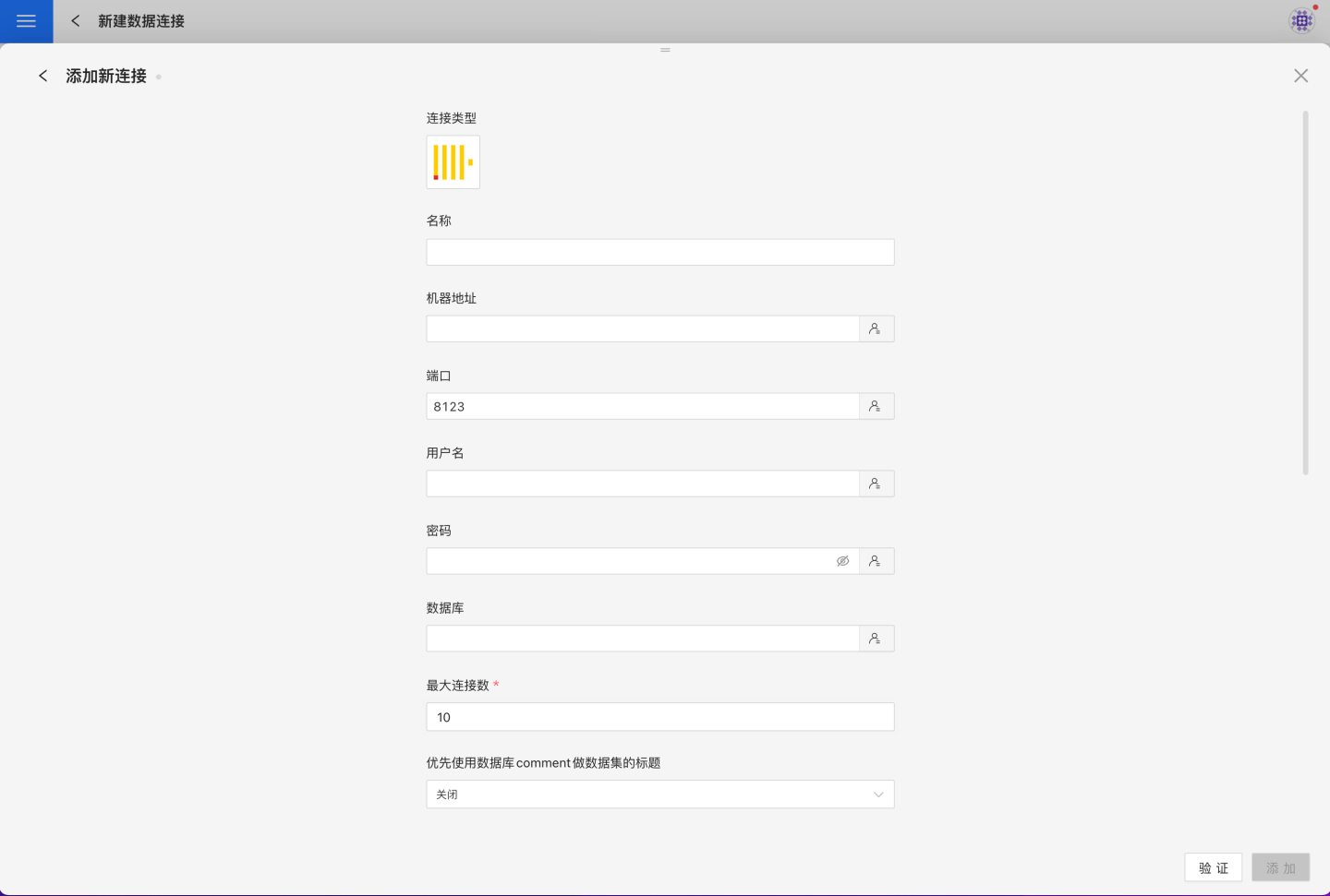 验证按钮,获取验证结果(验证 HENGSHI SENSE 和设置的数据连接的连通性,在未验证通过时不可添加)。验证通过后
