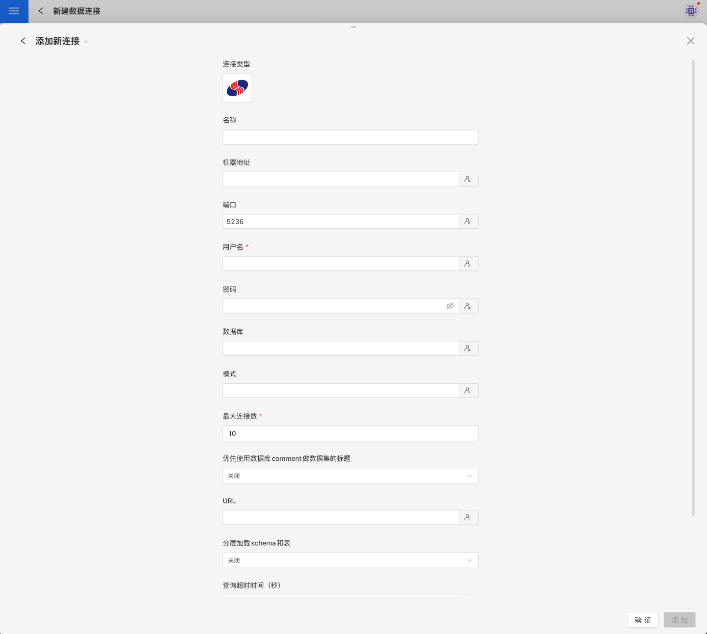 验证按钮,获取验证结果(验证 HENGSHI SENSE 和设置的数据连接的连通性,在未验证通过时不可添加)。验证通过后