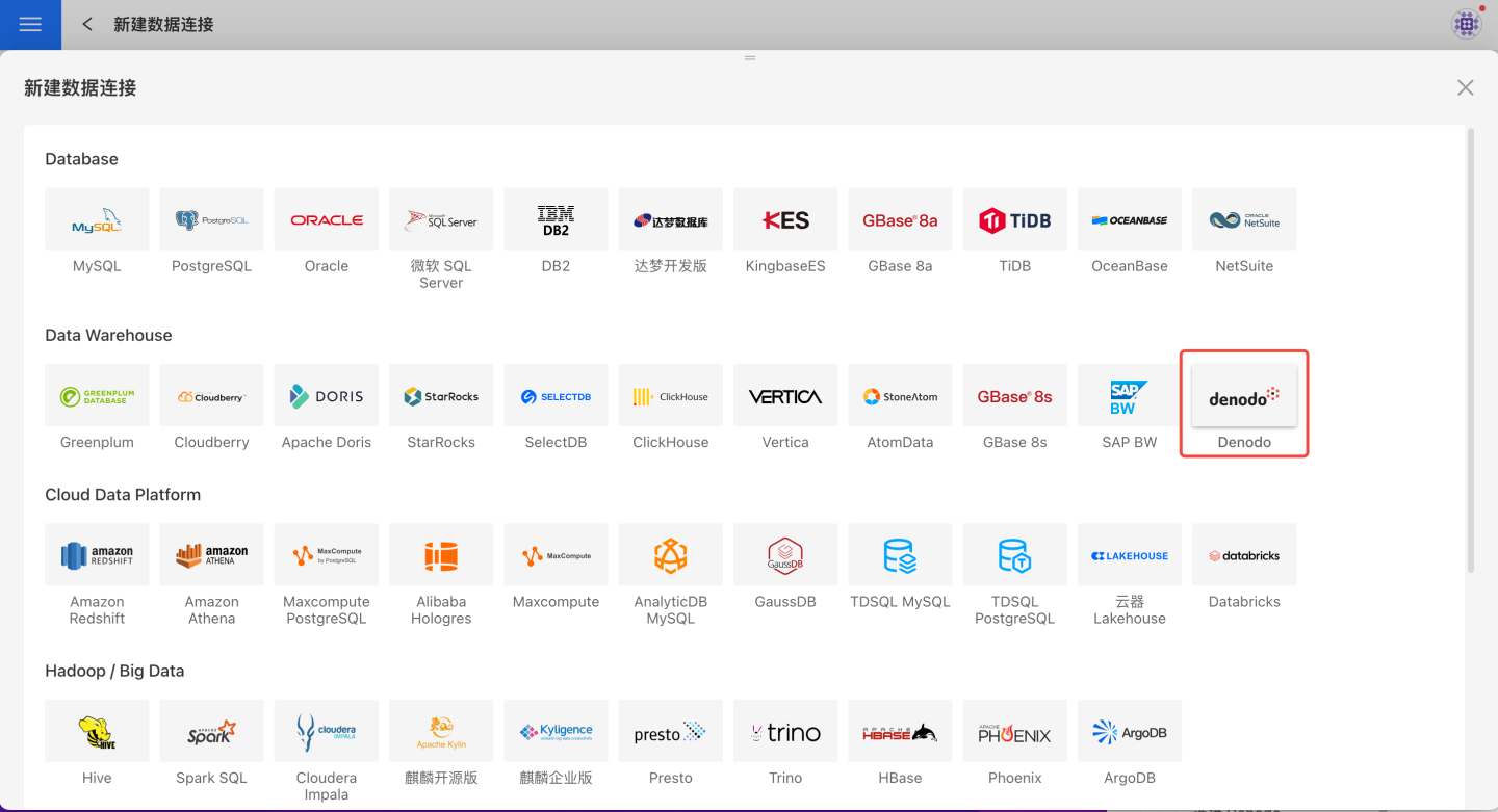 请参照如下步骤连接 Denodo 数据源。