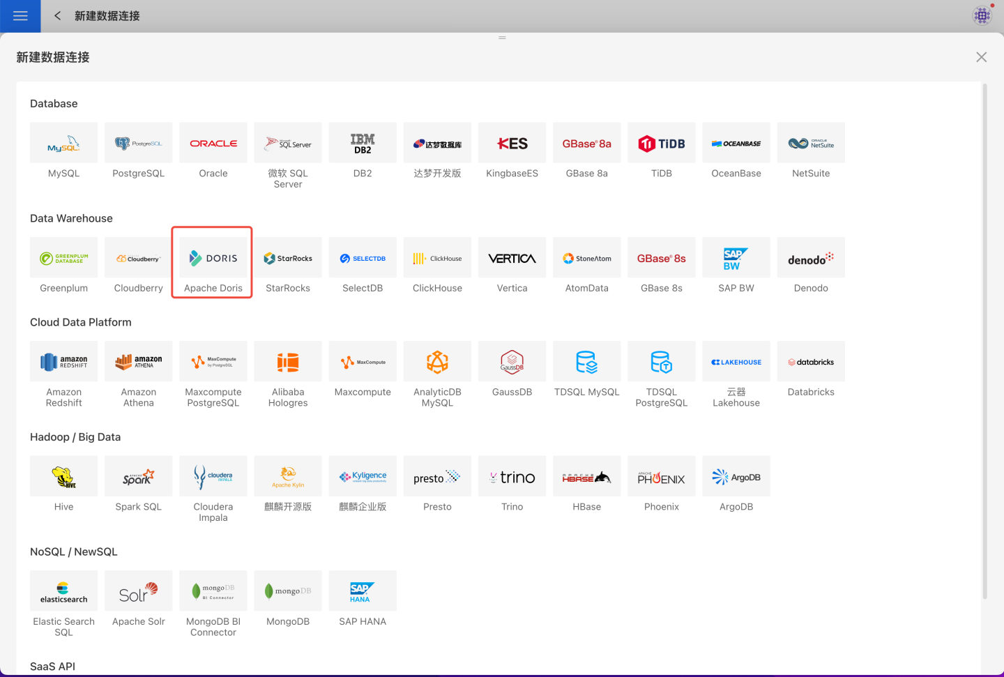 字段 说明 名称 连接的名称。必填,且用户内唯一 机器地址 数据库的地址。如果填了 url 字段,优先使用 url 里面的 端口 数据库的端口。如果填了 url 字段,优先使用 url 里面的 用户名 数据库的用户名 密码 数据库的密码 数据库 数据库名称 最大连接数 连接池最大连接数 编码 数据库连接的编码设置 优先使用数据库 comment 做数据集的标题 优先显示表的名字还是表的注释 URL 数据库的 jdbc url FE Http Port FE Http Port 是使用 stream load 的方式写入数据的端口。如果提供,写入性能会更好,否则使用 insert 写入。由于 stream load 会302跳转给 BE 的端口,所以要求衡石服务也能访问 BE 的端口才能正常使用这个功能。 分层加载 schema 和表 默认为 关闭。开启时分层加载 schema 和表,连接过程只加载 schema,需要点击schema才会加载schame下的table 查询超时时间(秒) 默认为 600. 当数据量较大时,可以适当增加超时时间 允许写入操作 表示该连接可以在数据集成,批量同步中选择为输出连接。需要有对数据库有写权限且验证通过后,才能配置该参数。 支持上传文件到指定路径 表示新建本地文件数据集时, 生成的表存放的数据库名称。需要有对数据库有写权限验且证通过后,才能配置该参数。 只显示指定数据库/模式下的表 该项选中时并且 database 字段不为空,则只显示该 db 下面的表 填好参数后,点击