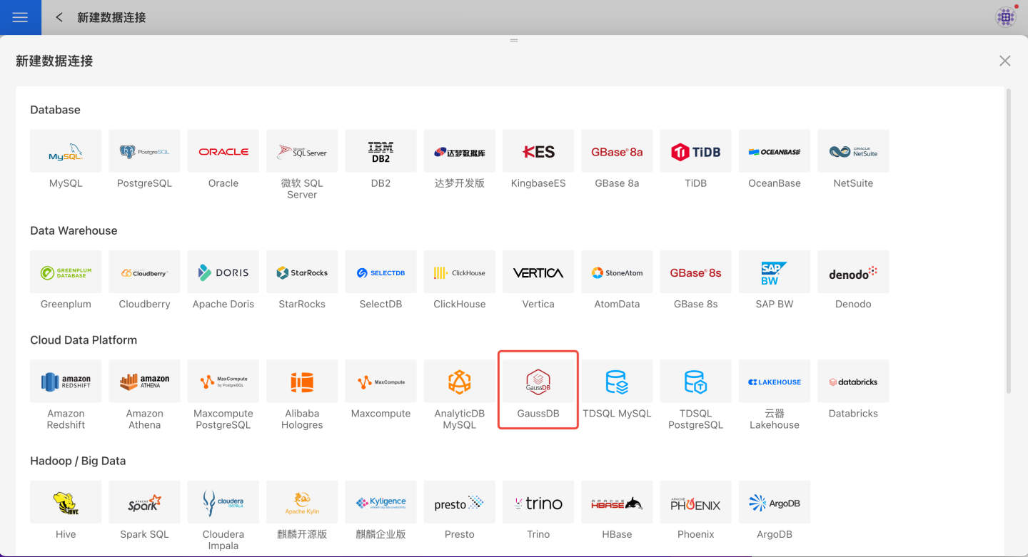 字段 说明 名称 连接的名称。必填,且用户内唯一 机器地址 数据库的地址。如果填了 url 字段,优先使用 url 里面的 端口 数据库的端口。如果填了 url 字段,优先使用 url 里面的 用户名 数据库的用户名 密码 数据库的密码 数据库 数据库名称 模式 数据库的schema 最大连接数 连接池最大连接数 编码 数据库连接的编码设置 ssl 是否使用 ssl 连接 sslmode 根据 GaussDB 的配置来填写,如"disable"、"allow"、"prefer"、"require"、"verify-ca"、"verify-full" Logical Decoding Output Plugin 仅当 作为流式同步数据源的时候需要填写。根据实际配置填写逻辑复制插件名称 优先使用数据库 comment 做数据集的标题 优先显示表的名字还是表的注释。开启时显示标题,关闭时显示表注释 URL 数据库的 jdbc url 读取行为的事务隔离级别 读取行为的事务隔离级别。该设置只影响读取数据,写入数据还是用默认的隔离级别。 分层加载 schema 和表 默认为 关闭。开启时分层加载 schema 和表,连接过程只加载 schema,需要点击schema才会加载schame下的table 查询超时时间(秒) 默认为 600. 当数据量较大时,可以适当增加超时时间 允许写入操作 表示该连接可以在数据集成,批量同步中选择为输出连接。需要有对数据库有写权限且验证通过后,才能配置该参数。 支持上传文件到指定路径 表示新建本地文件数据集时, 生成的表存放的数据库名称。需要有对数据库有写权限验且证通过后,才能配置该参数。 只显示指定数据库/模式下的表 该项选中时并且 database 字段不为空,则只显示该 db 下面的表 填好参数后,点击