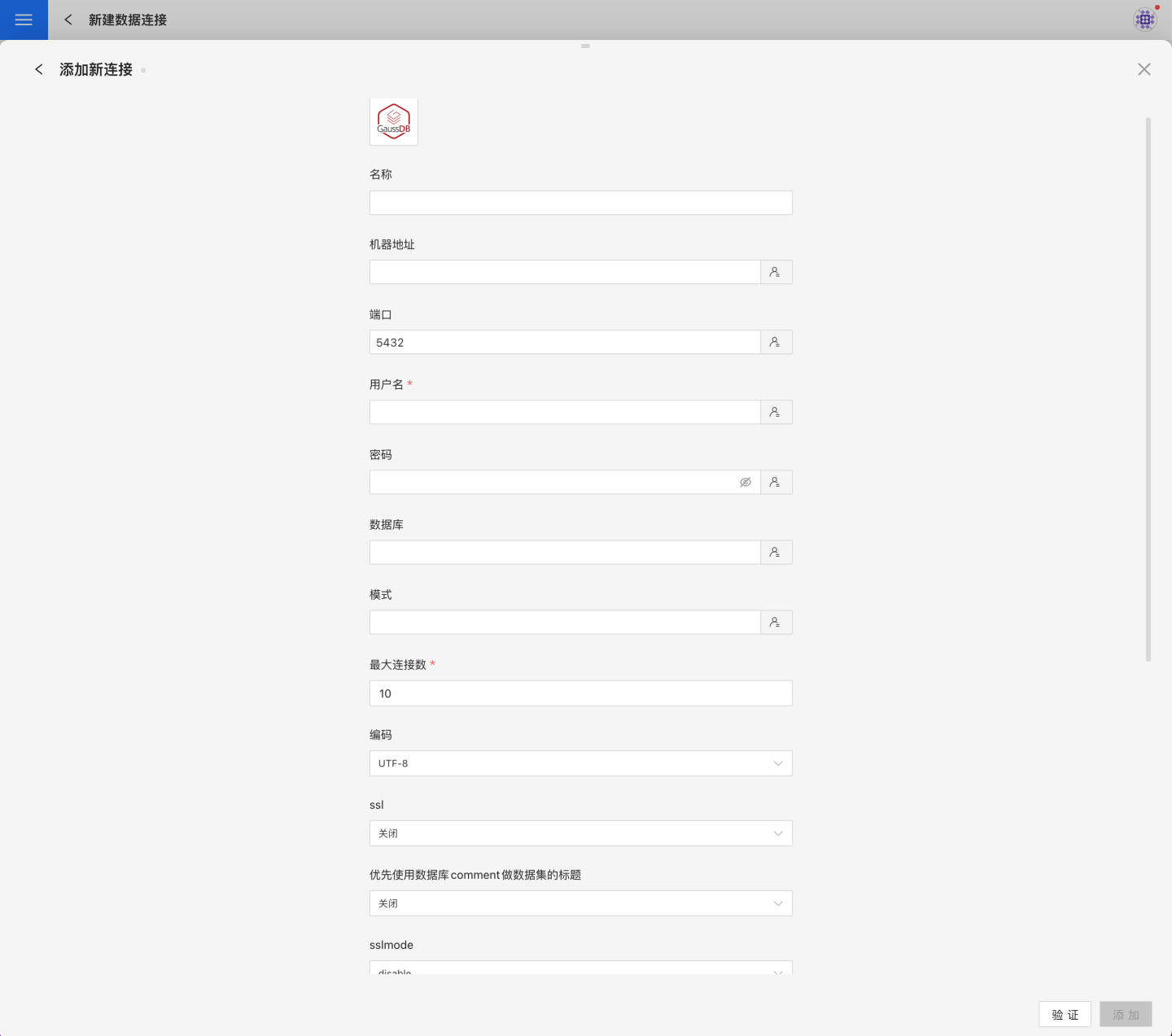 验证按钮,获取验证结果(验证 HENGSHI SENSE 和设置的数据连接的连通性,在未验证通过时不可添加)。验证通过后