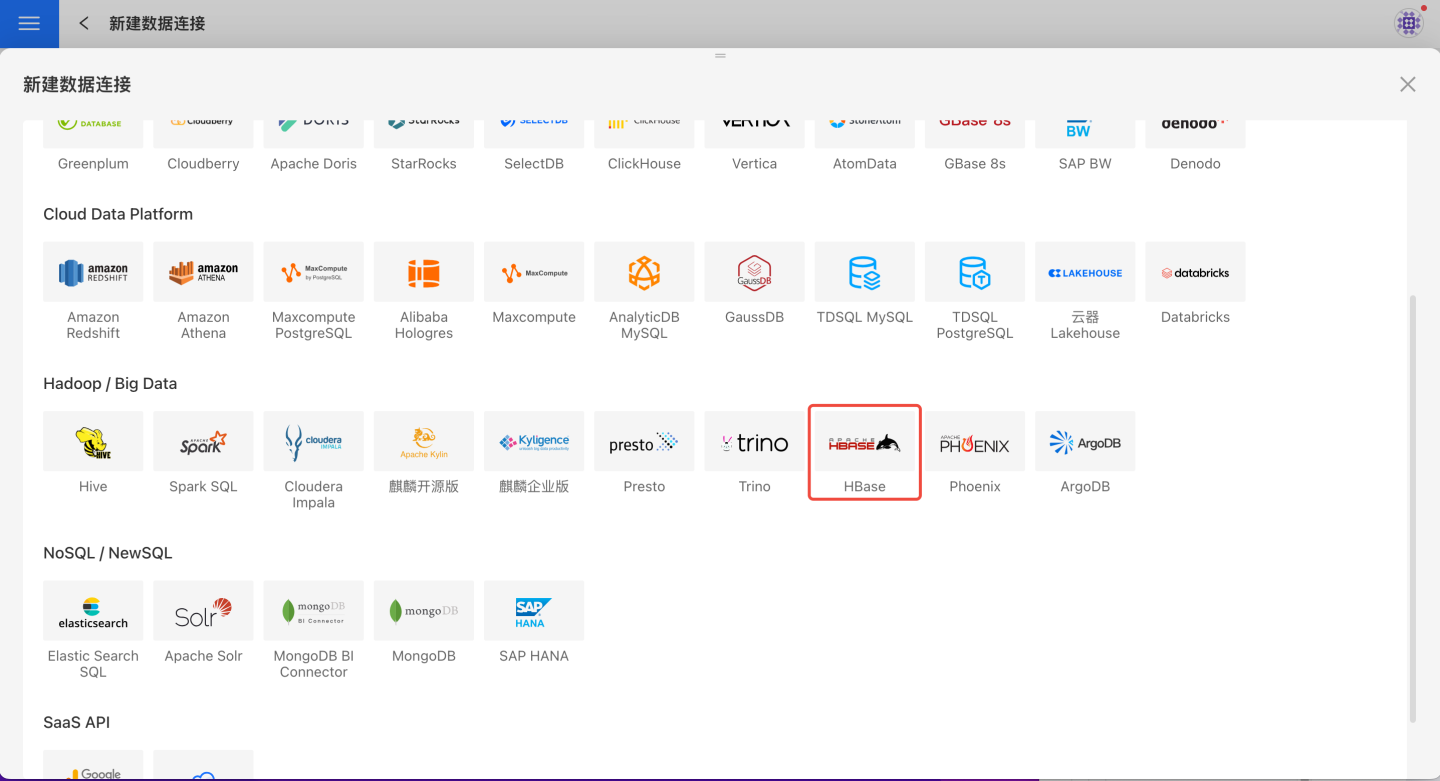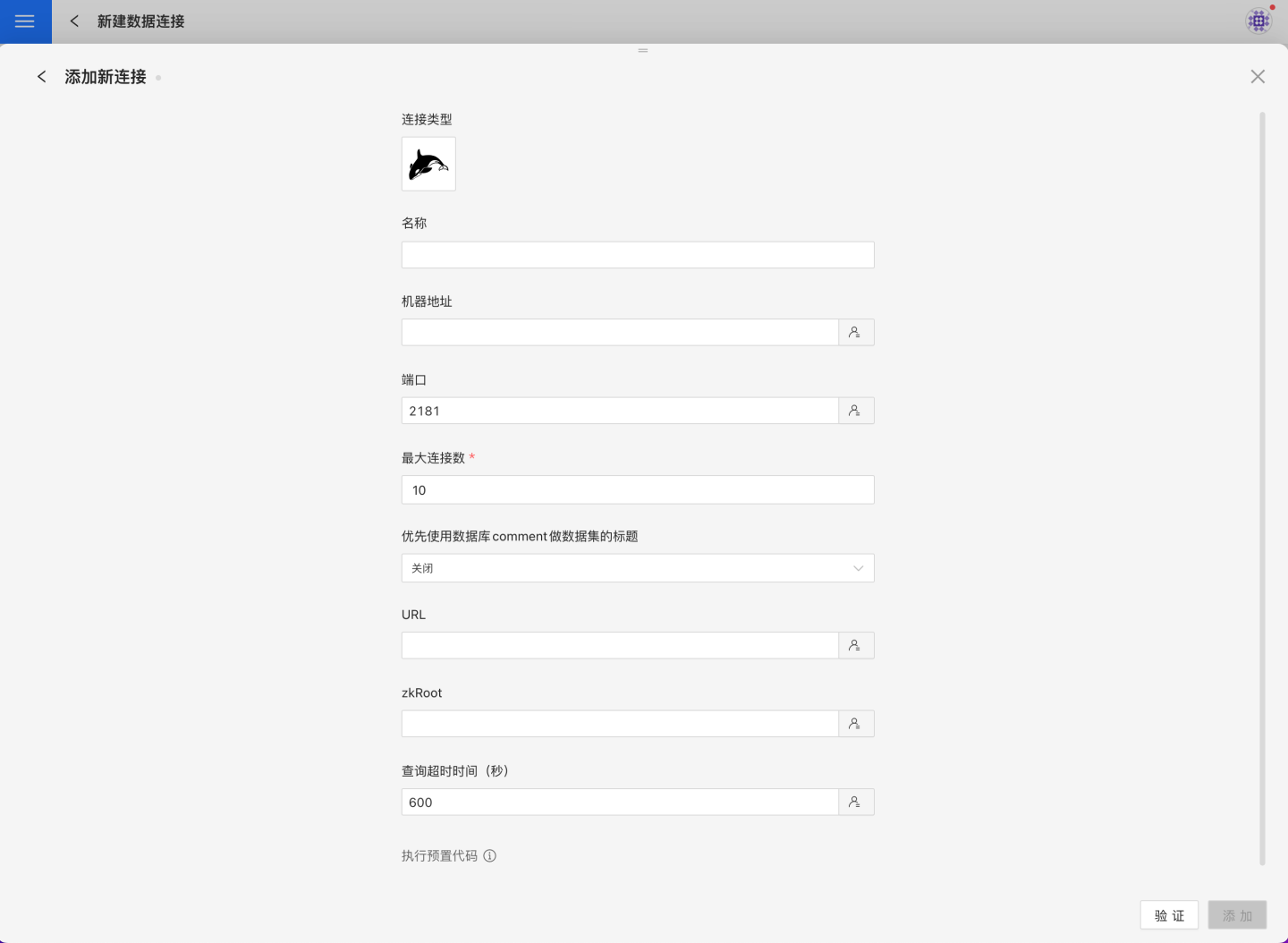 字段 说明 名称 连接的名称。必填,且用户内唯一 机器地址 数据库的地址。如果填了 url 字段,优先使用 url 里面的 端口 数据库的端口。如果填了 url 字段,优先使用 url 里面的 最大连接数 连接池最大连接数 优先使用数据库 comment 做数据集的标题 优先显示表的名字还是表的注释。开启时显示标题,关闭时显示表注释 URL zkRoot 查询超时时间(秒) 默认为 600. 当数据量较大时,可以适当增加超时时间 只显示指定数据库/模式下的表 该项选中时并且 database 字段不为空,则只显示该 db 下面的表 填好参数后,点击