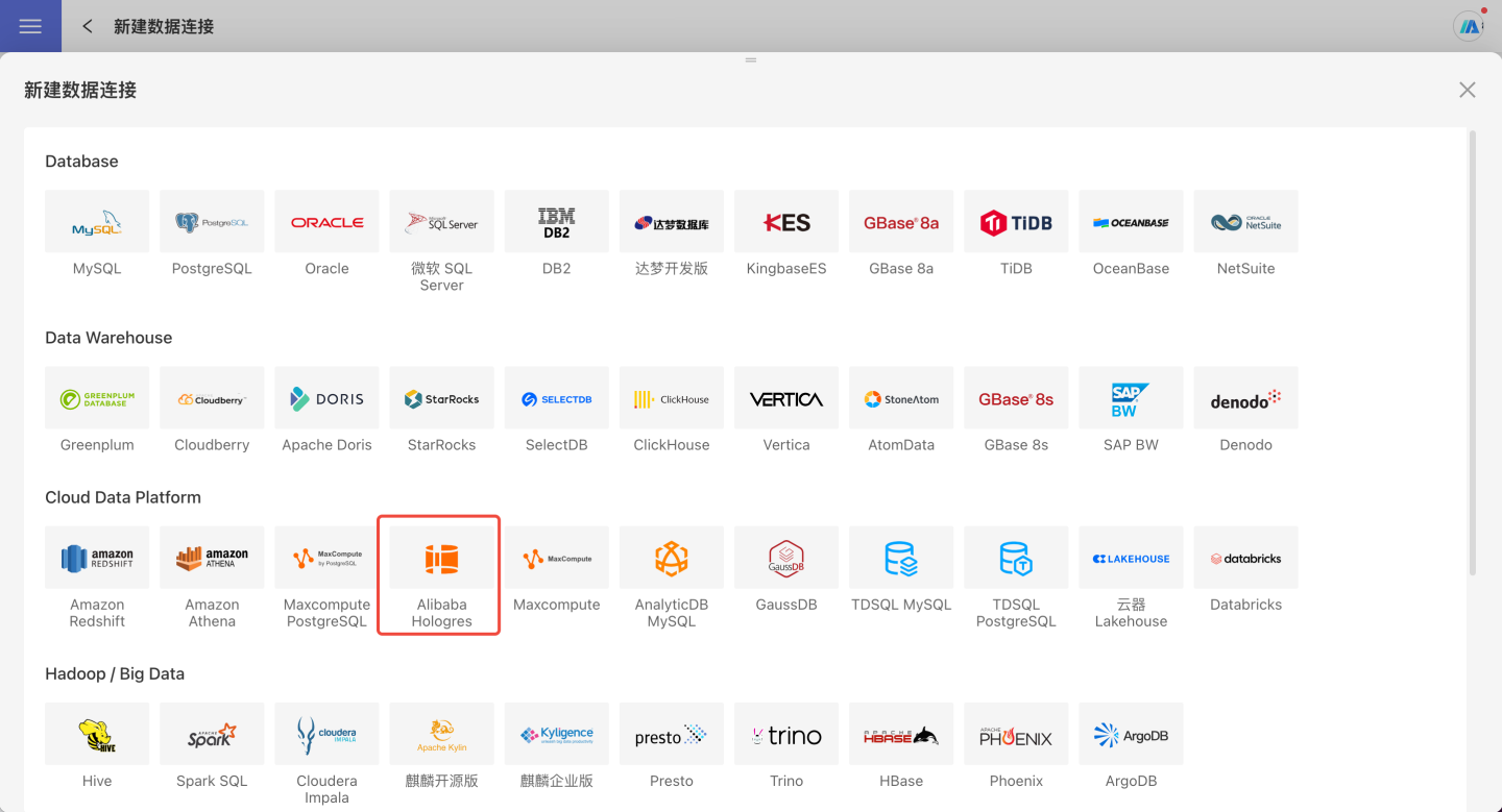 2.在数据源种类中选择 Alibaba Hologres 数据源。