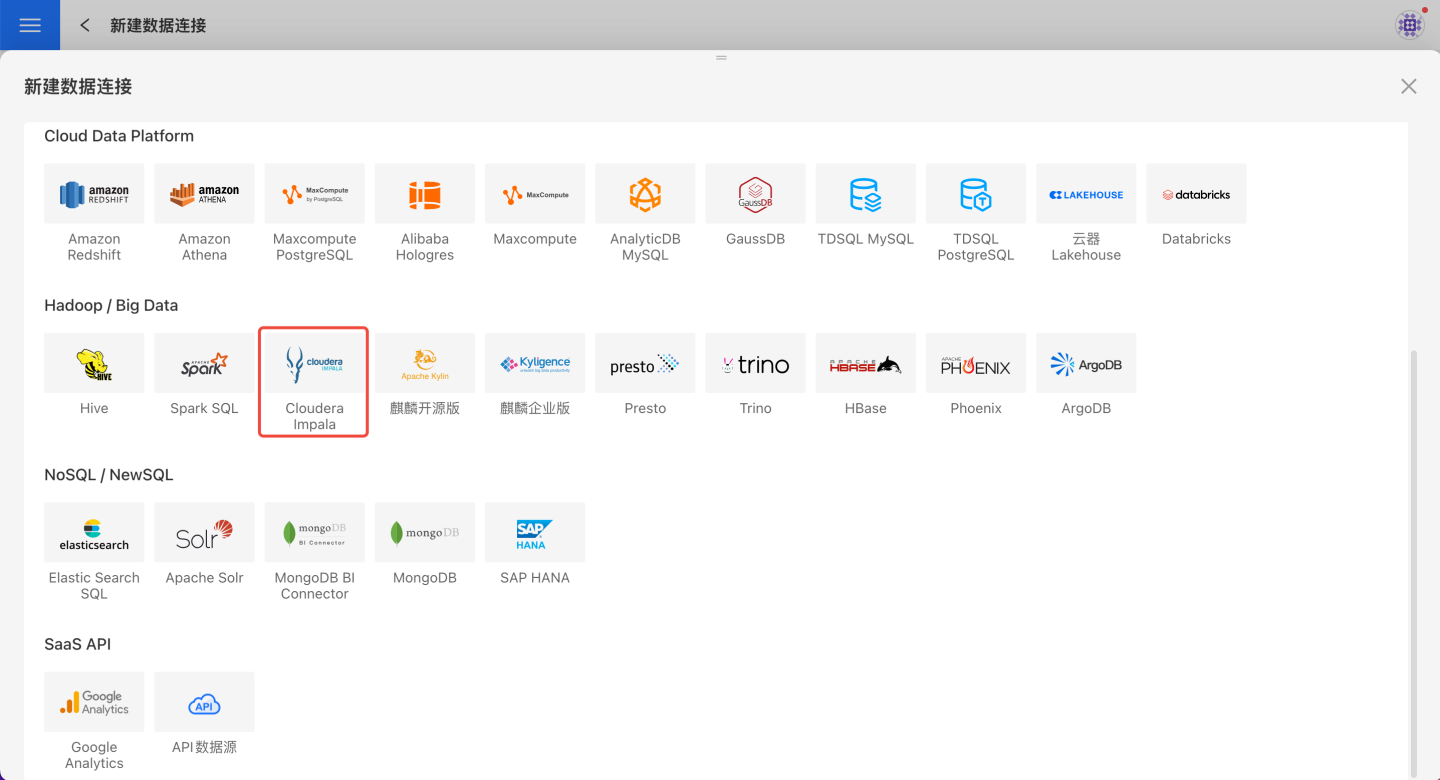请参照如下步骤连接 Cloudera Impala 数据源。