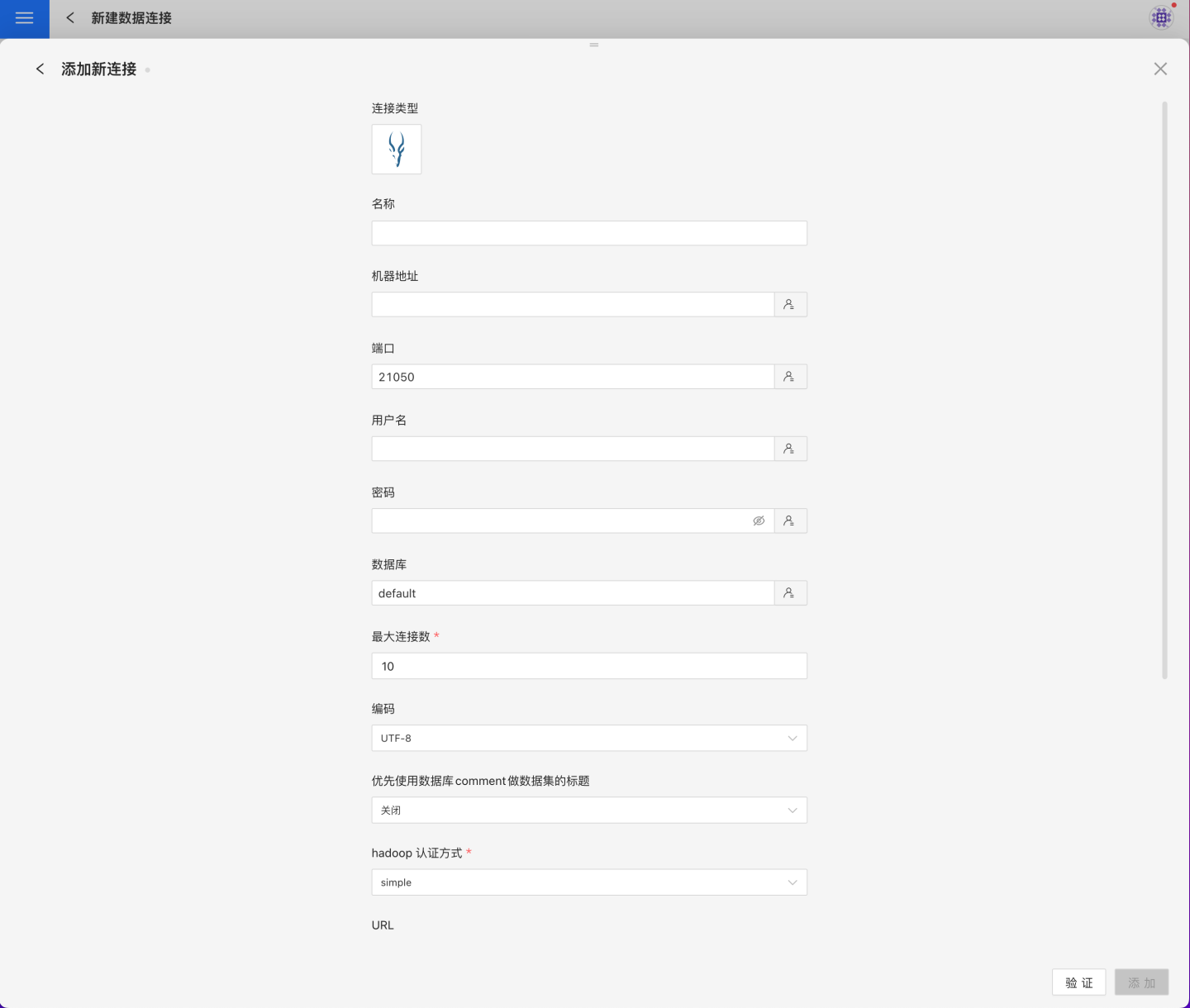 验证按钮,获取验证结果(验证 HENGSHI SENSE 和设置的数据连接的连通性,在未验证通过时不可添加)。验证通过后