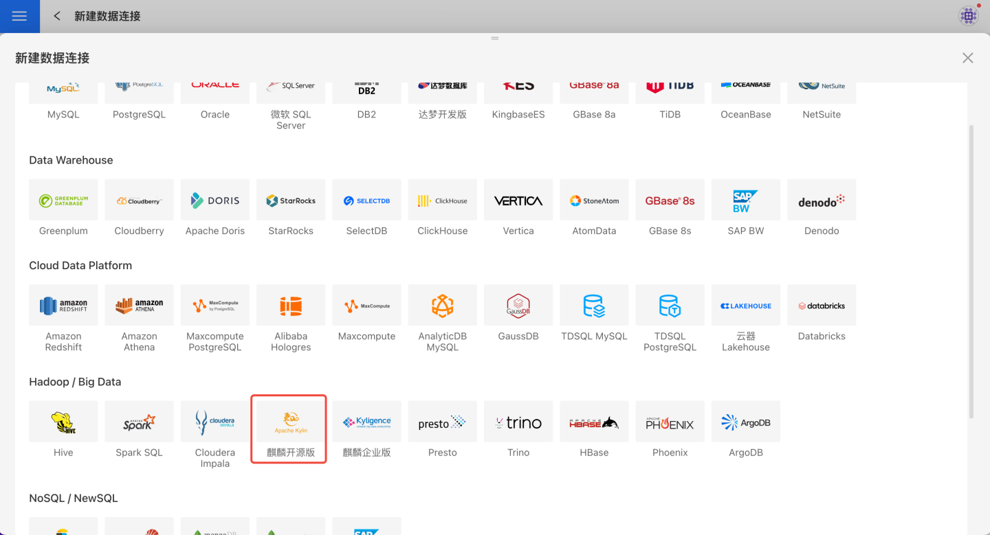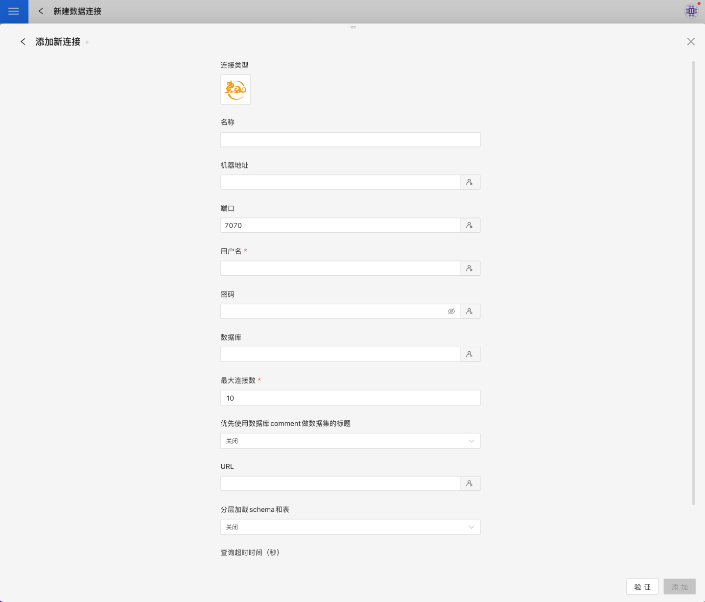 字段 说明 名称 连接的名称。必填,且用户内唯一 机器地址 数据库的地址 端口 数据库的端口 用户名 数据库的用户名 密码 数据库的密码 数据库 数据库名称 最大连接数 连接池最大连接数 优先使用数据库 comment 做数据集的标题 优先显示表的名字还是表的注释。开启时显示标题,关闭时显示表注释 URL 数据库的 jdbc url 分层加载 schema 和表 默认为 关闭。开启时分层加载 schema 和表,连接过程只加载 schema,需要点击schema才会加载schame下的table 查询超时时间(秒) 默认为 600. 当数据量较大时,可以适当增加超时时间 只显示指定数据库/模式下的表 该项选中时并且 database 字段不为空,则只显示该 db 下面的表 填好参数后,点击