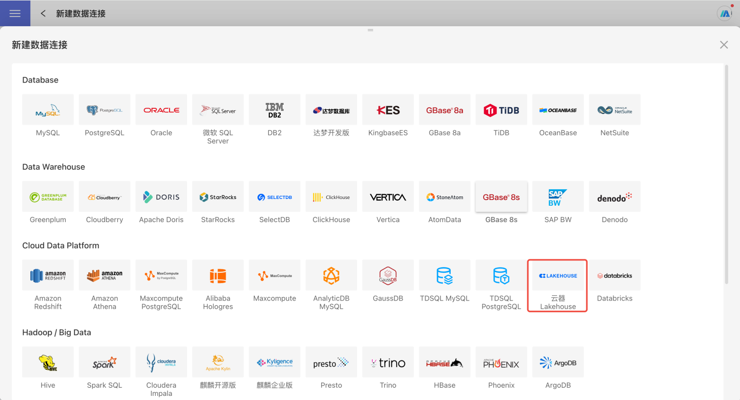 请参照如下步骤连接 云器Lakehouse 数据源。