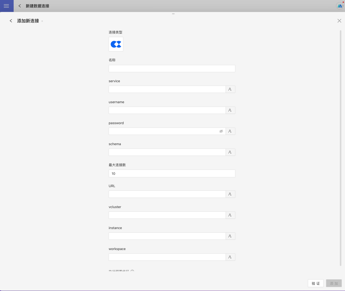 字段 说明 名称 连接的名称。必填,且用户内唯一 service 数据库的地址 username 数据库的用户名 password 数据库的密码 schema 数据库的schema 最大连接数 连接池最大连接数 URL 数据库的 jdbc url vcluster 虚拟集群 instance 实例名 workspace 工作空间 填好参数后,点击