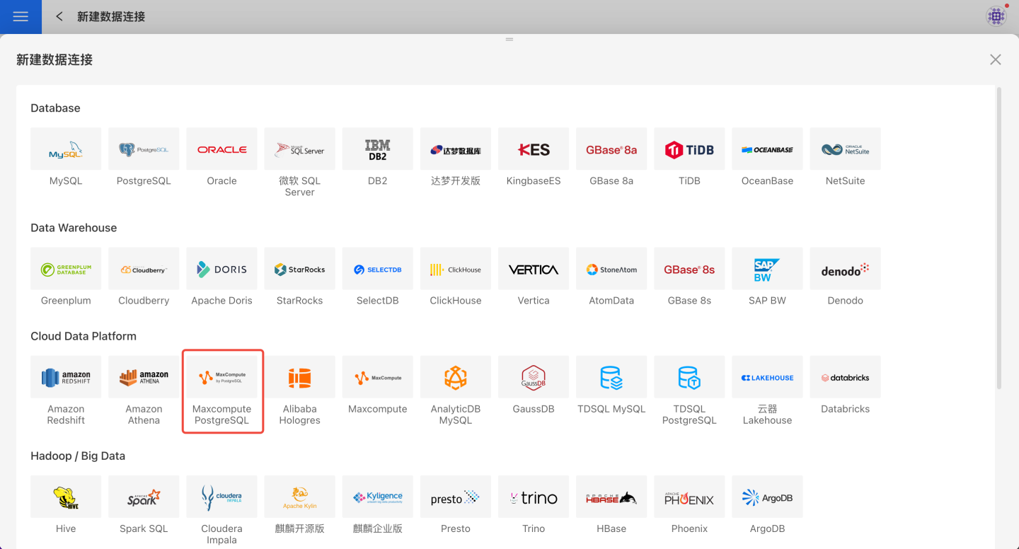 请参照如下步骤连接 Maxcompute PostgreSQL 数据源。