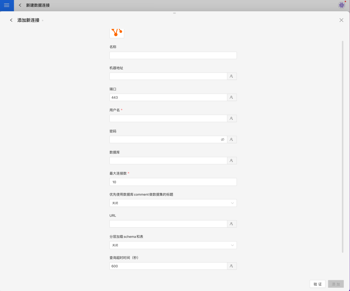 验证按钮,获取验证结果(验证 HENGSHI SENSE 和设置的数据连接的连通性,在未验证通过时不可添加)。验证通过后,点击