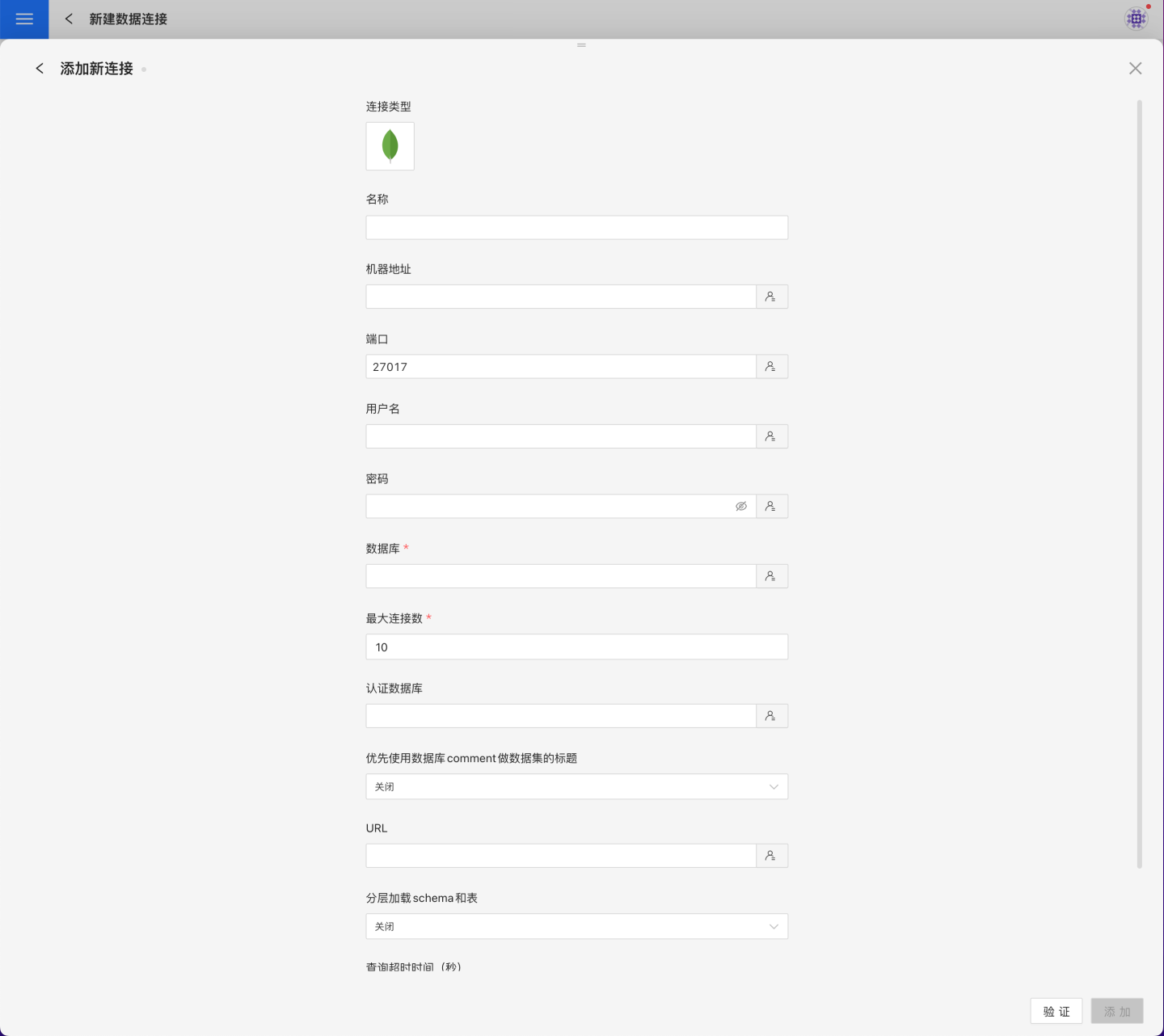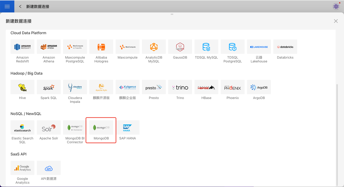 请参照如下步骤连接 MongoDB 数据源。