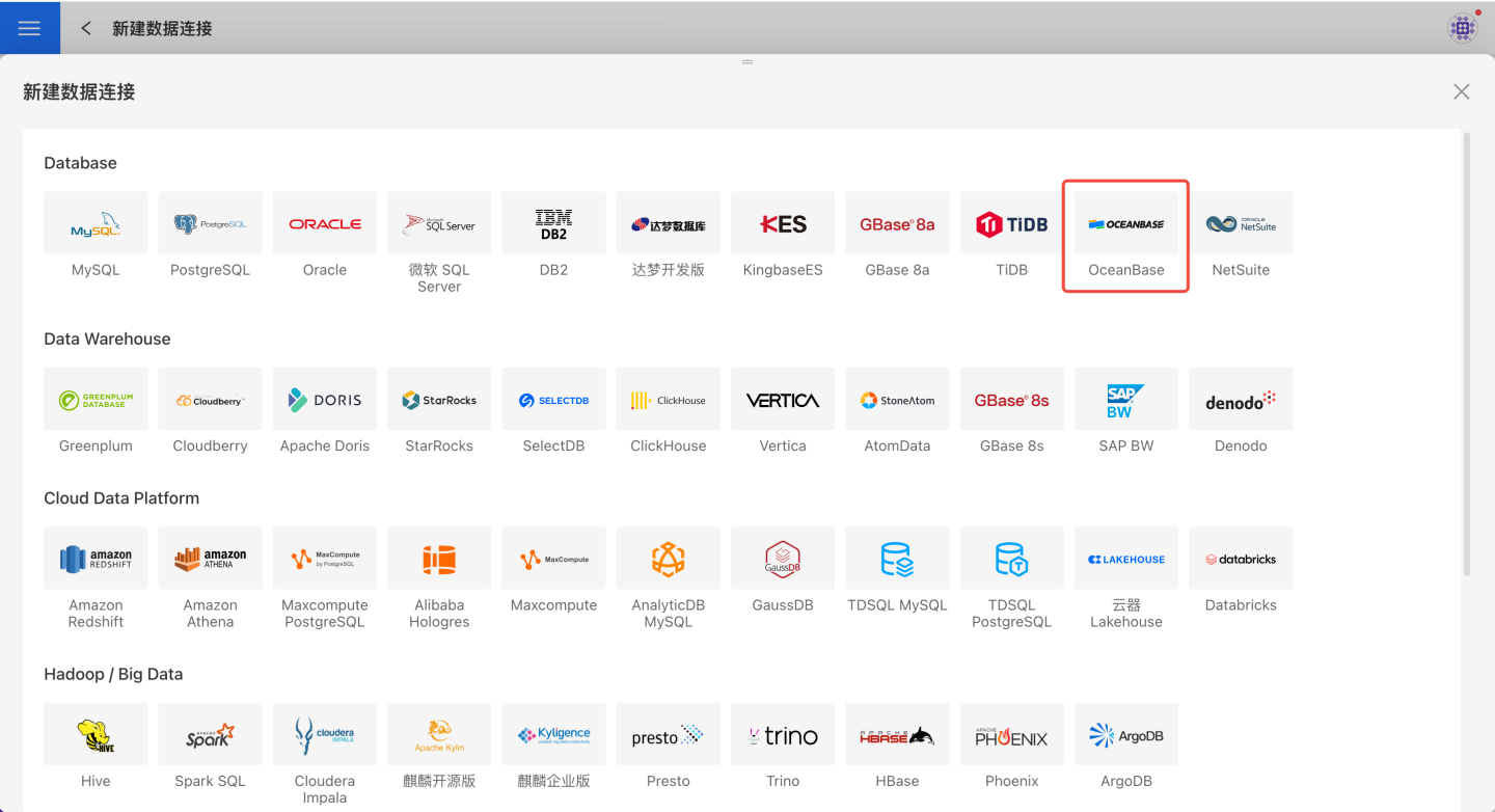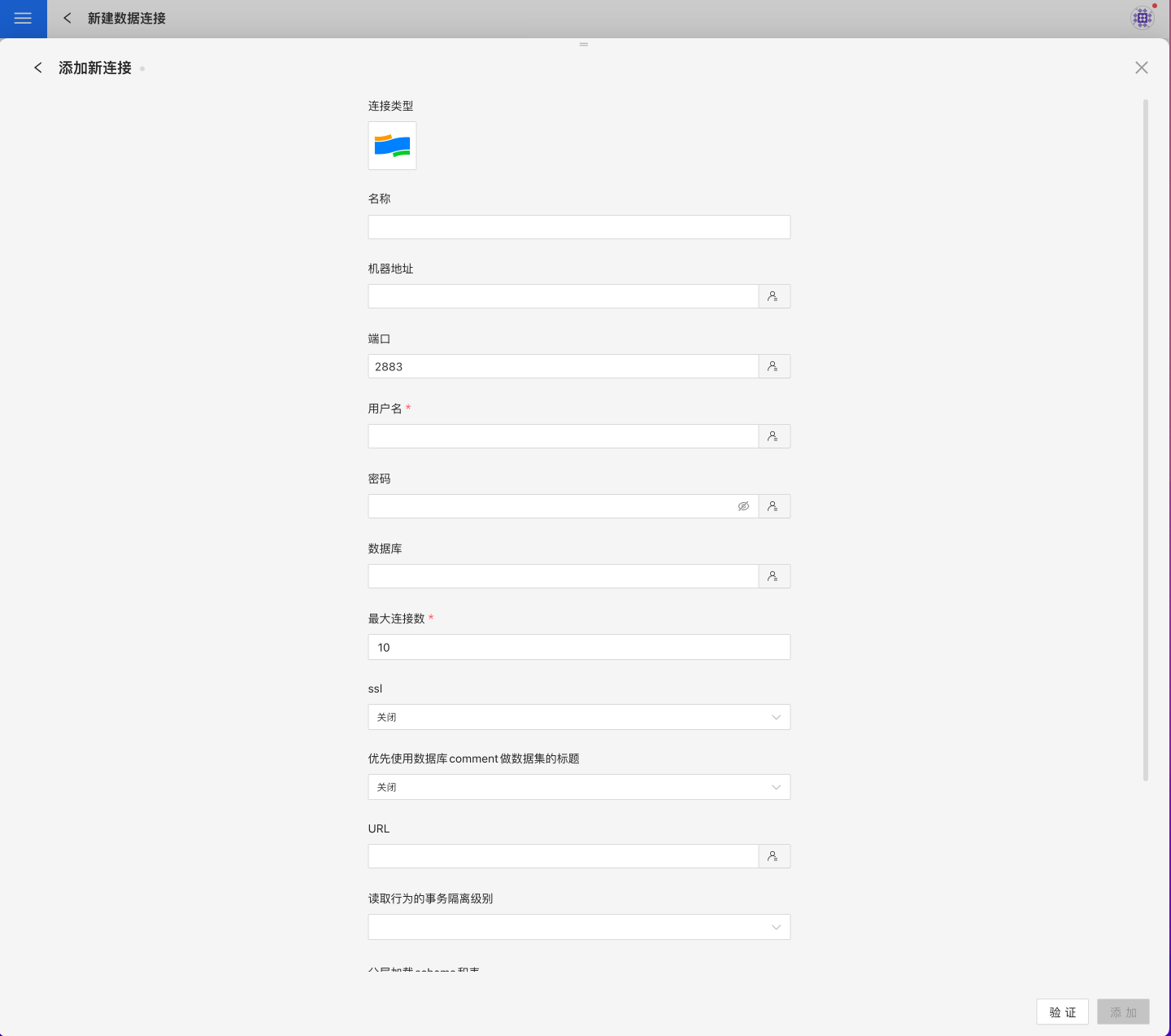 字段 说明 名称 连接的名称。必填,且用户内唯一 机器地址 数据库的地址。如果填了 url 字段,优先使用 url 里面的 端口 数据库的端口。如果填了 url 字段,优先使用 url 里面的 用户名 数据库的用户名 密码 数据库的密码 数据库 数据库名称 最大连接数 连接池最大连接数 ssl 是否使用ssl连接 优先使用数据库 comment 做数据集的标题 优先显示表的名字还是表的注释。开启时显示标题,关闭时显示表注释 URL 数据库的 jdbc url 读取行为的事务隔离级别 该设置只影响读取数据,写入数据还是用默认的隔离级别 分层加载 schema 和表 默认为 关闭。开启时分层加载 schema 和表,连接过程只加载 schema,需要点击schema才会加载schame下的table 查询超时时间(秒) 默认为 600. 当数据量较大时,可以适当增加超时时间 允许写入操作 表示该连接可以在数据集成,批量同步中选择为输出连接。需要有对数据库有写权限且验证通过后,才能配置该参数。 支持上传文件到指定路径 表示新建本地文件数据集时, 生成的表存放的数据库名称。需要有对数据库有写权限验且证通过后,才能配置该参数。 只显示指定数据库/模式下的表 该项选中时并且 database 字段不为空,则只显示该 db 下面的表 填好参数后,点击