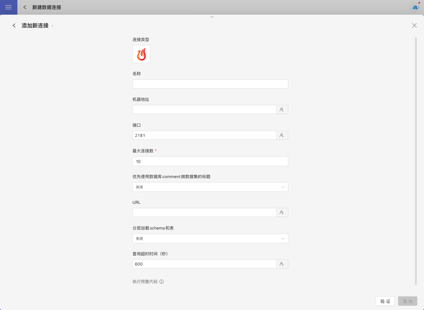 验证按钮,获取验证结果(验证 HENGSHI SENSE 和设置的数据连接的连通性,在未验证通过时不可添加)。验证通过后点击