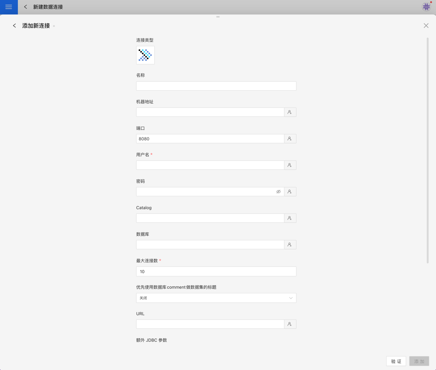 字段 说明 名称 连接的名称。必填,且用户内唯一 机器地址 数据库的地址。如果填了 url 字段,优先使用 url 里面的 端口 数据库的端口。如果填了 url 字段,优先使用 url 里面的 用户名 数据库的用户名 密码 数据库的密码 数据库 数据库名称 Catalog Catalog 最大连接数 连接池最大连接数 优先使用数据库 comment 做数据集的标题 优先显示表的名字还是表的注释 URL 数据库的 jdbc url 额外 JDBC 参数 额外 JDBC 参数。建议使用 url 写完整 url。这个参数只添加在自动生成的 jdbc url 的后面 分层加载 schema 和表 默认为 关闭。开启时分层加载 schema 和表,连接过程只加载 schema,需要点击schema才会加载schame下的table 查询超时时间(秒) 默认为 600. 当数据量较大时,可以适当增加超时时间 允许写入操作 表示该连接可以在数据集成,批量同步中选择为输出连接。需要有对数据库有写权限且验证通过后,才能配置该参数。 支持上传文件到指定路径 表示新建本地文件数据集时, 生成的表存放的数据库名称。需要有对数据库有写权限验且证通过后,才能配置该参数。 只显示指定数据库/模式下的表 该项选中时并且 database 字段不为空,则只显示该 db 下面的表 填好参数后,点击