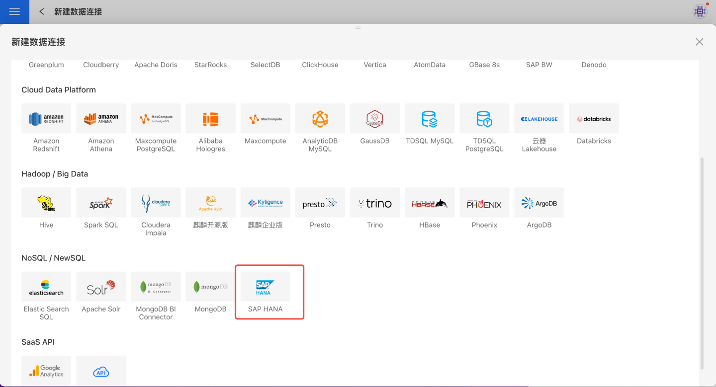 请参照如下步骤连接 SAP HANA 数据源。