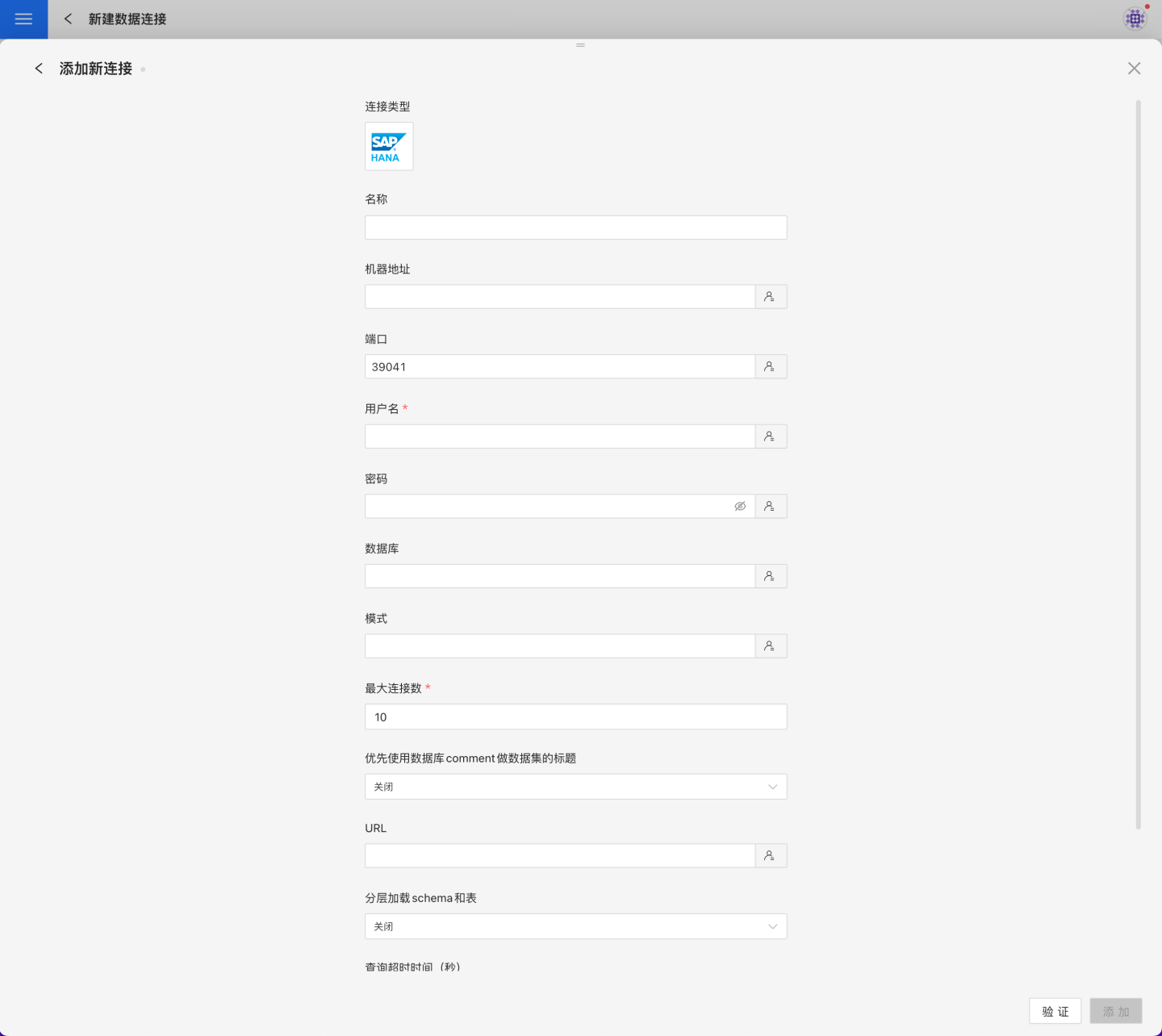 验证按钮,获取验证结果(验证 HENGSHI SENSE 和设置的数据连接的连通性,在未验证通过时不可添加)。验证通过后