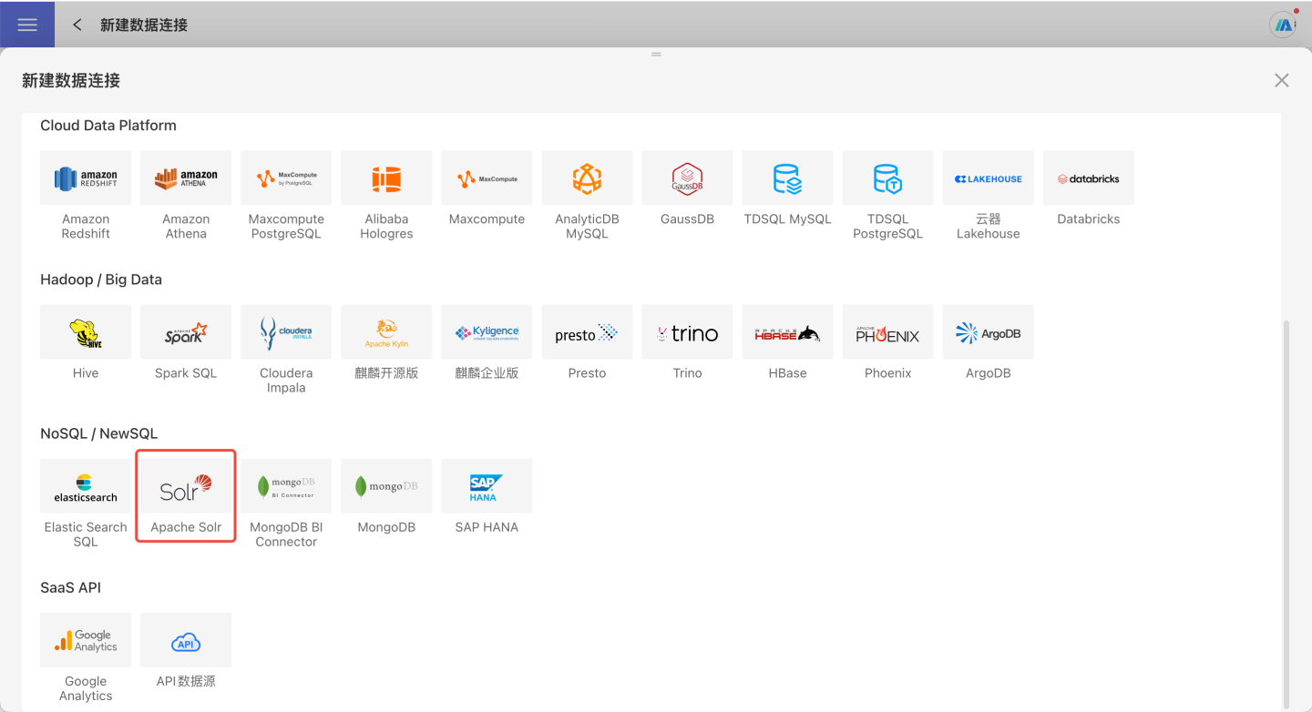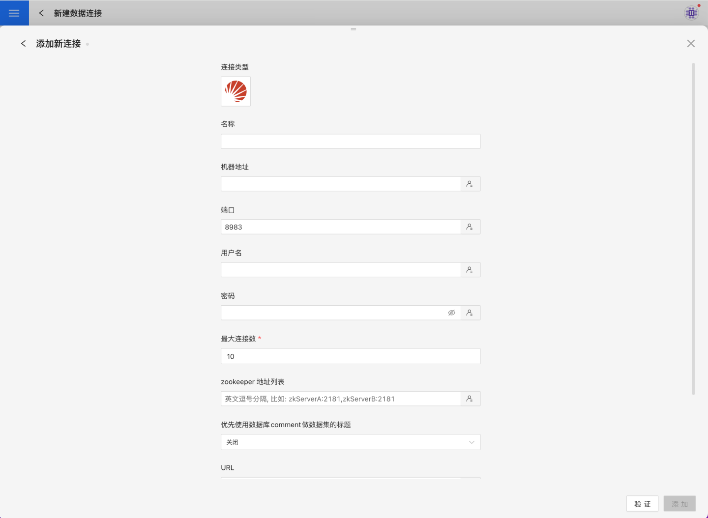 字段 说明 名称 连接的名称。必填,且用户内唯一 机器地址 数据库的地址。如果填了 url 字段,优先使用 url 里面的 端口 数据库的端口。如果填了 url 字段,优先使用 url 里面的 用户名 数据库的用户名 密码 数据库的密码 最大连接数 连接池最大连接数 zookeeper 地址列表 zookeeper 地址列表,英文逗号分隔, 比如: zkServerA:2181,zkServerB:2181 优先使用数据库 comment 做数据集的标题 优先显示表的名字还是表的注释。开启时显示标题,关闭时显示表注释 URL 查询超时时间(秒) 默认为 600. 当数据量较大时,可以适当增加超时时间 只显示指定数据库/模式下的表 该项选中时并且 database 字段不为空,则只显示该 db 下面的表 填好参数后,点击