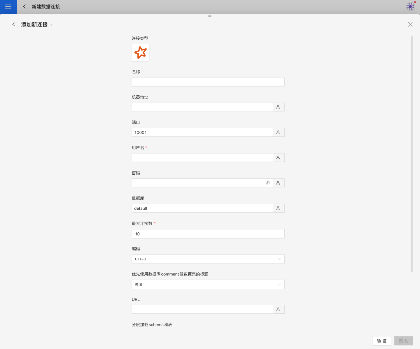 验证按钮,获取验证结果(验证 HENGSHI SENSE 和设置的数据连接的连通性,在未验证通过时不可添加)。验证通过后,点击