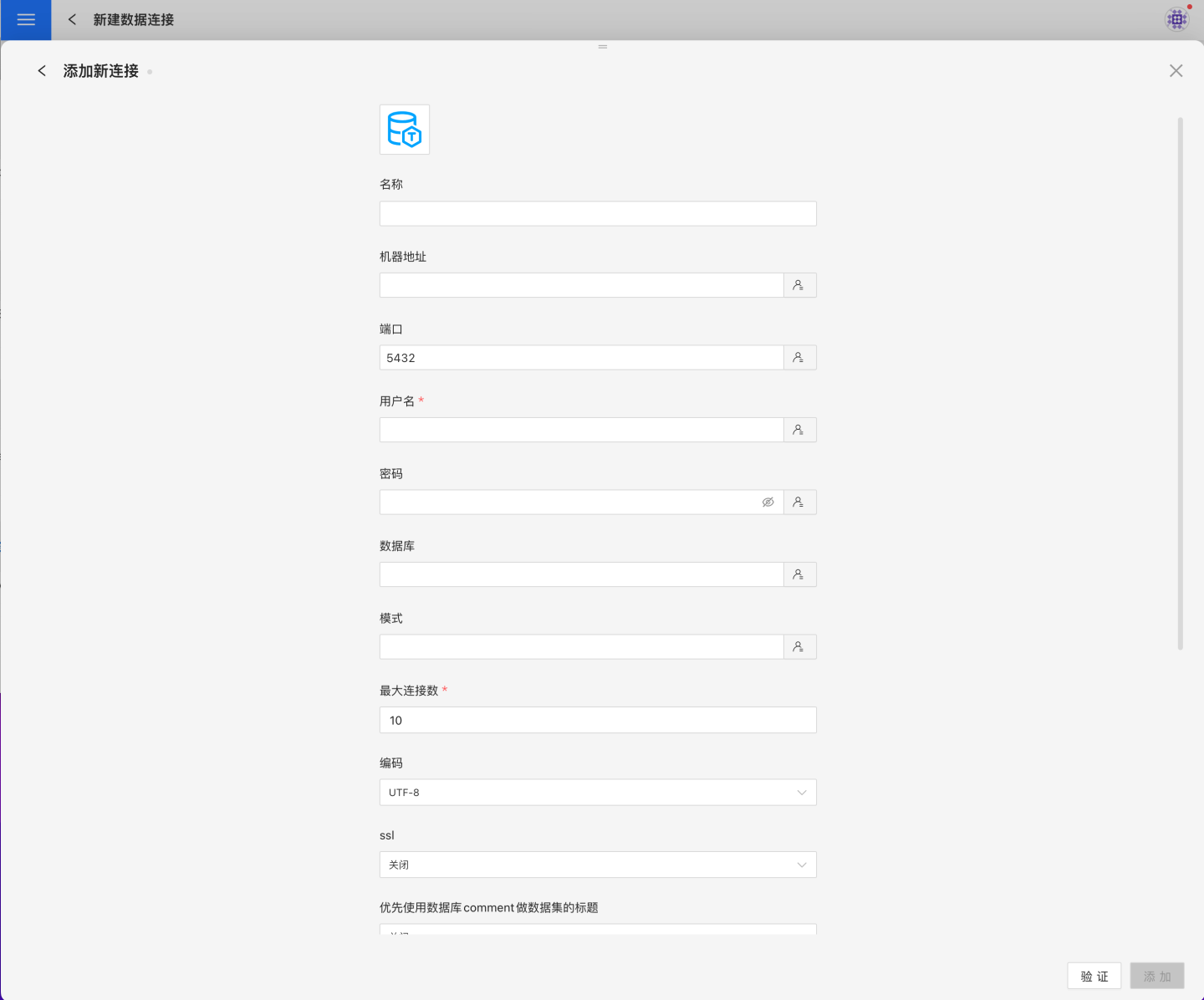 字段 说明 名称 连接的名称。必填,且用户内唯一 机器地址 数据库的地址。如果填了 url 字段,优先使用 url 里面的 端口 数据库的端口。如果填了 url 字段,优先使用 url 里面的 用户名 数据库的用户名 密码 数据库的密码 数据库 数据库名称 模式 数据库的schema 最大连接数 连接池最大连接数 编码 数据库连接的编码设置 ssl 是否使用 ssl 连接 优先使用数据库 comment 做数据集的标题 优先显示表的名字还是表的注释。开启时显示标题,关闭时显示表注释 sslmode 根据 postgresql 的配置来填写,如"disable","allow","prefer" ,"require","verify-ca","verify-full" URL 数据库的 jdbc url 分层加载 schema 和表 默认为 关闭。开启时分层加载 schema 和表,连接过程只加载 schema,需要点击schema才会加载schame下的table 查询超时时间(秒) 默认为 600. 当数据量较大时,可以适当增加超时时间 允许写入操作 表示该连接可以在数据集成,批量同步中选择为输出连接。需要有对数据库有写权限且验证通过后,才能配置该参数。 支持上传文件到指定路径 表示新建本地文件数据集时, 生成的表存放的数据库名称。需要有对数据库有写权限验且证通过后,才能配置该参数。 只显示指定数据库/模式下的表 该项选中时并且 database 字段不为空,则只显示该 db 下面的表 填好参数后,点击