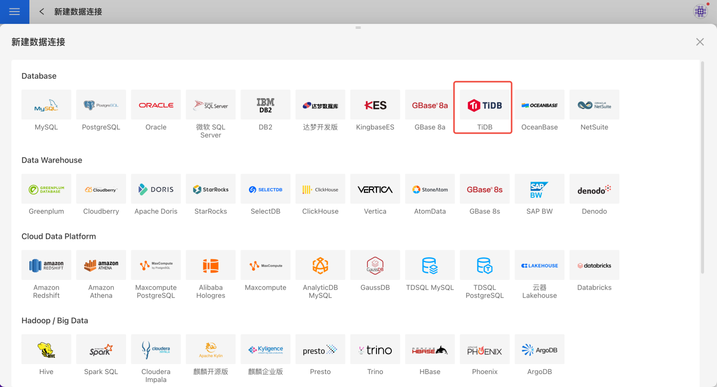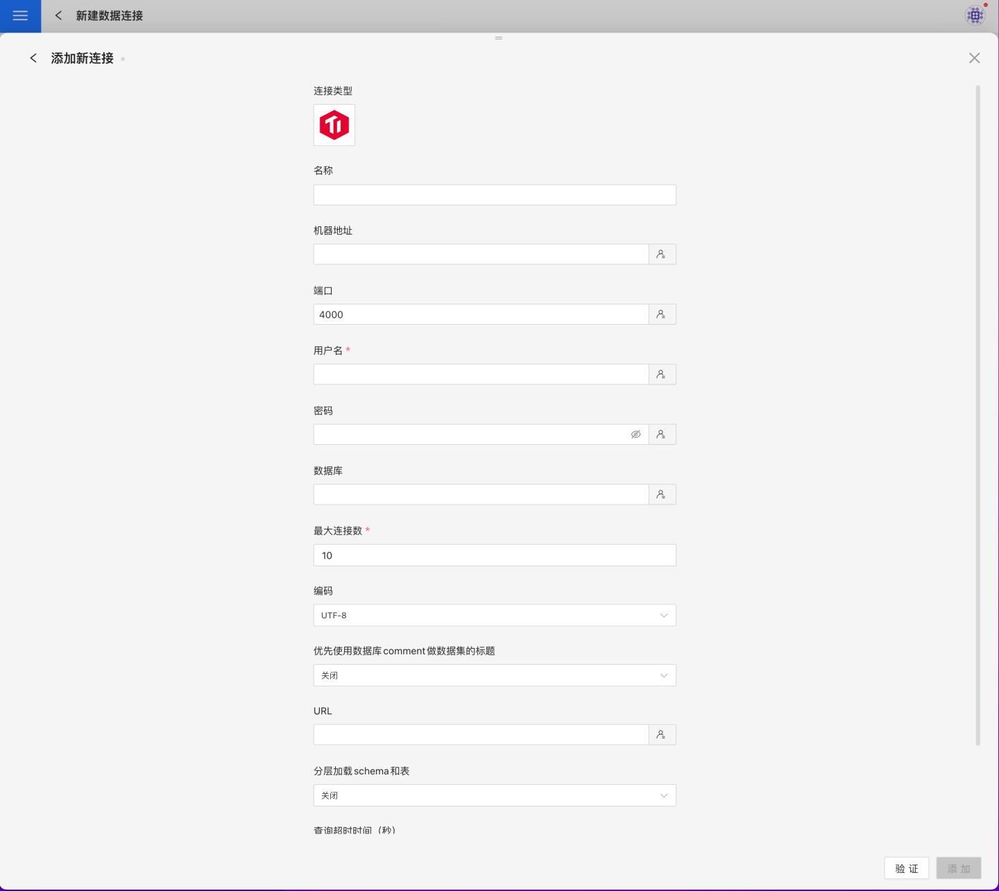 字段 说明 名称 连接的名称。必填,且用户内唯一 机器地址 数据库的地址。如果填了 url 字段,优先使用 url 里面的 端口 数据库的端口。如果填了 url 字段,优先使用 url 里面的 用户名 数据库的用户名 密码 数据库的密码 数据库 数据库名称 最大连接数 连接池最大连接数 优先使用数据库 comment 做数据集的标题 优先显示表的名字还是表的注释。开启时显示标题,关闭时显示表注释 URL 数据库的 jdbc url 分层加载 schema 和表 默认为 关闭。开启时分层加载 schema 和表,连接过程只加载 schema,需要点击schema才会加载schame下的table 查询超时时间(秒) 默认为 600. 当数据量较大时,可以适当增加超时时间 只显示指定数据库/模式下的表 该项选中时并且 database 字段不为空,则只显示该 db 下面的表 填好参数后,点击