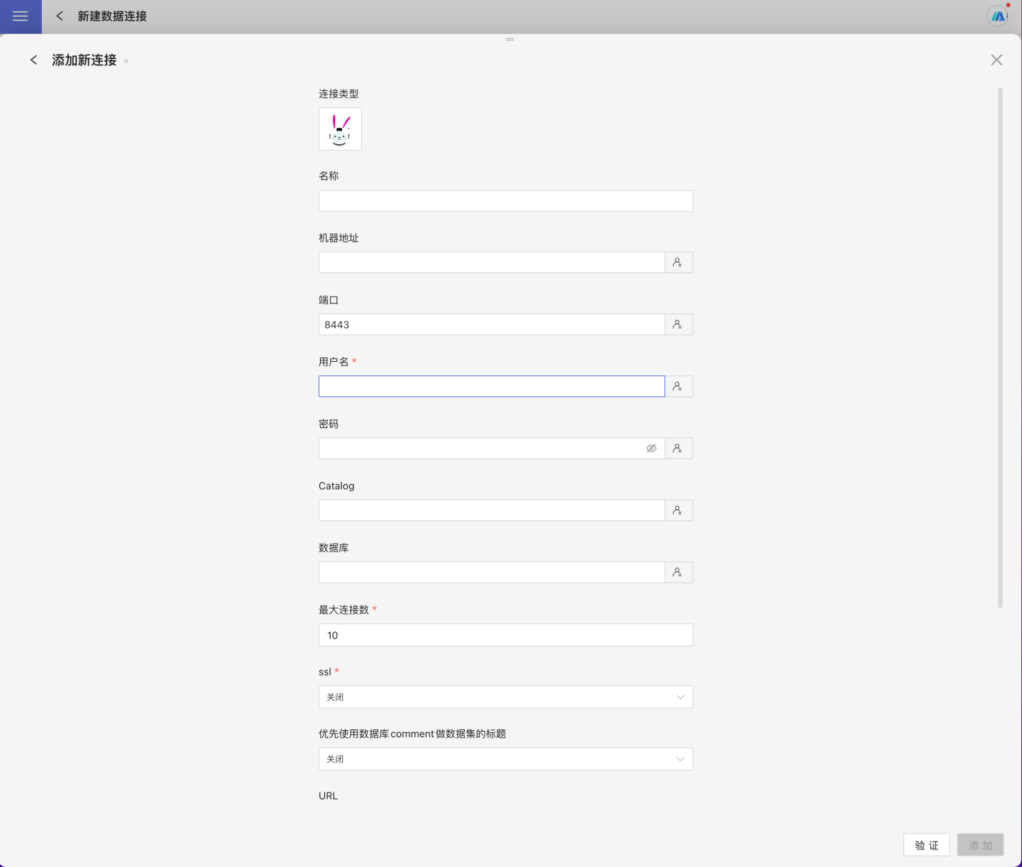 字段 说明 名称 连接的名称。必填,且用户内唯一 机器地址 数据库的地址。如果填了 url 字段,优先使用 url 里面的 端口 数据库的端口。如果填了 url 字段,优先使用 url 里面的 用户名 数据库的用户名 密码 数据库的密码 数据库 数据库名称 Catalog 数据库的Catalog 最大连接数 连接池最大连接数 ssl 是否使用 ssl 连接 优先使用数据库 comment 做数据集的标题 优先显示表的名字还是表的注释 URL 数据库的 jdbc url 额外 JDBC 参数 URL 额外 JDBC 参数。建议使用 url 写完整 url。这个参数只添加在自动生成的 jdbc url 的后面 分层加载 schema 和表 默认为 关闭。开启时分层加载 schema 和表,连接过程只加载 schema,需要点击schema才会加载schame下的table 查询超时时间(秒) 默认为 600. 当数据量较大时,可以适当增加超时时间 只显示指定数据库/模式下的表 该项选中时并且 database 字段不为空,则只显示该 db 下面的表 填好参数后,点击