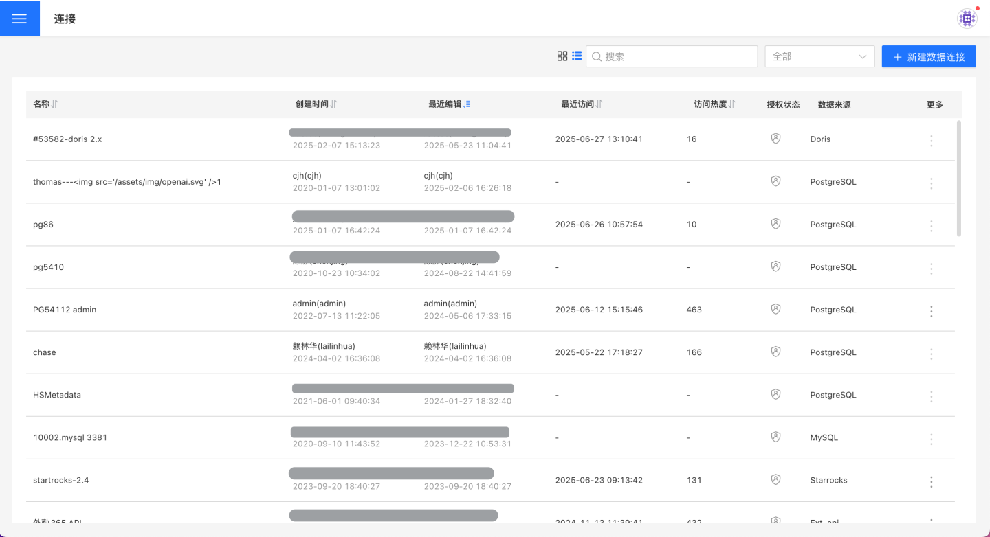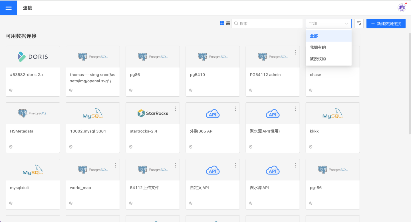 在右上角的搜索框中可以搜索连接,还可以通过下拉列表查看全部连接、我创建的、授权给我的。