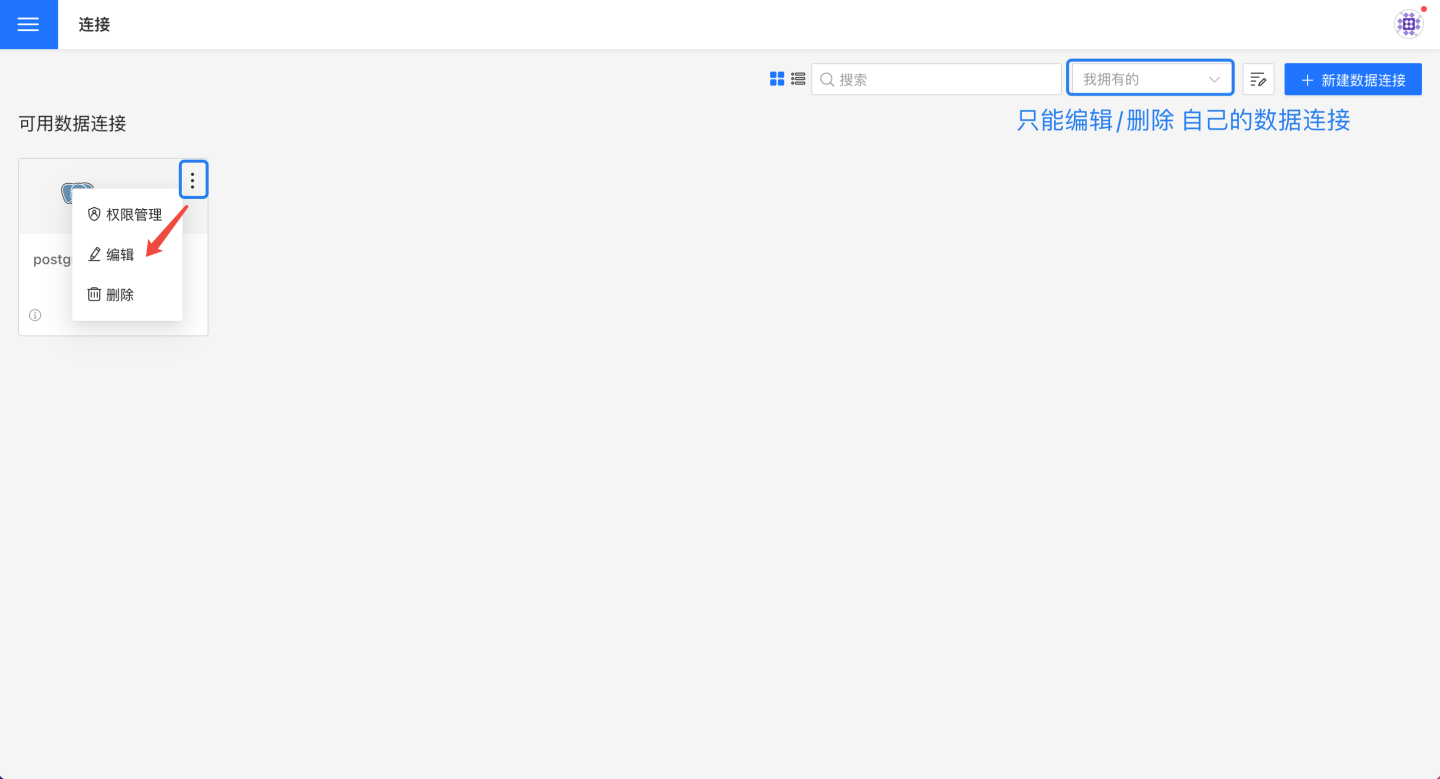 连接创建者点击连接的三点菜单,可以对连接进行权限管理、编辑和删除操作。