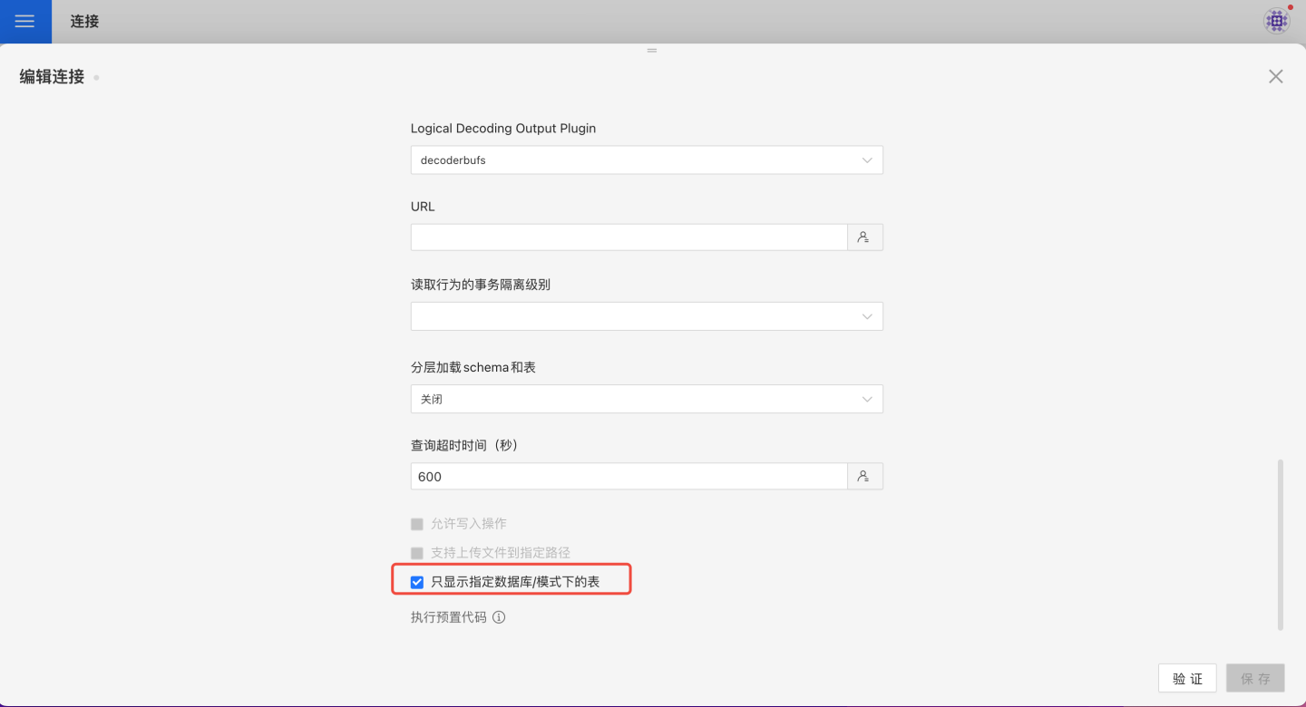 在新建/编辑数据连接页面,选中只显示指定数据库/模式下的表,打开连接后,将只显示指定的数据库/模式下的表,如果未选中该选项,则会显示用户有权看到的所有数据库和模式。